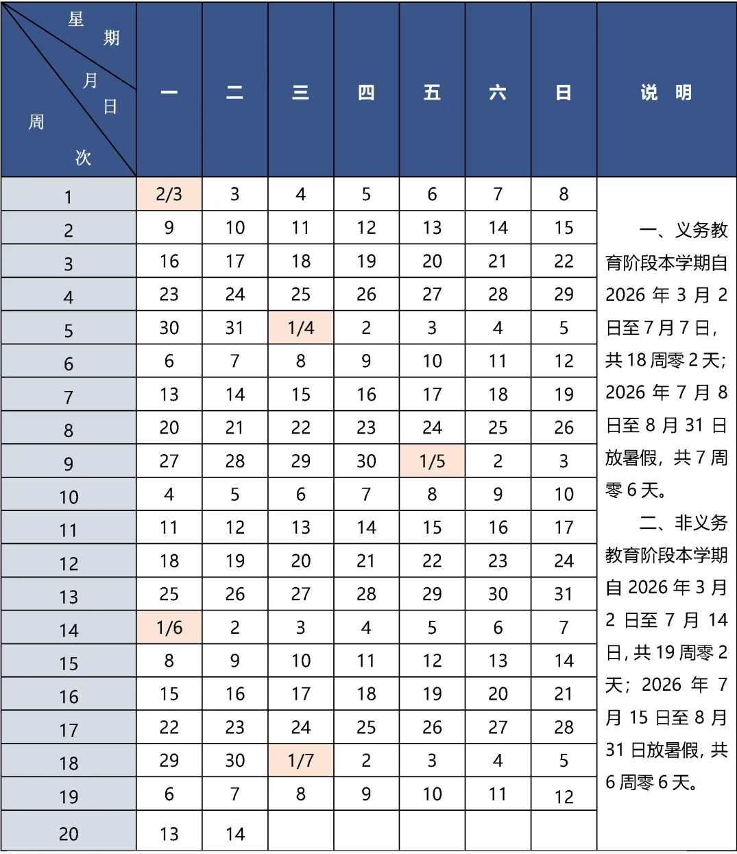 非义务教育阶段第二学期2026年3月2日开学,2026年7月14日结束本学期工作,共19周零2天;2026年7月15日至8月31日放暑假,共6周零6天。