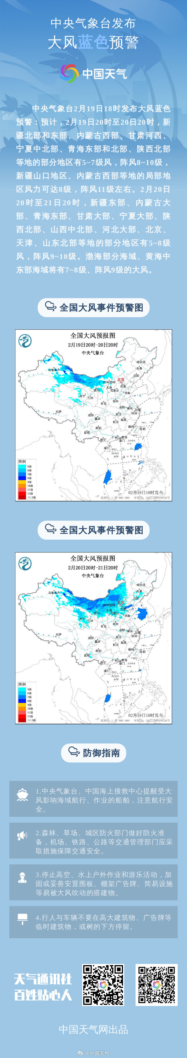 预计,2月19日20时至20日20时,新疆北部和东部、内蒙古西部、甘肃河西、宁夏中北部、青海东部和北部、陕西北部等地的部分地区有5~7级风,阵风8~10级,新疆山口地区、内蒙古西部等地的局部地区风力可达8级,阵风11级左右。2月20日20时至21日20时,新疆东部、内蒙古大部、青海东部、甘肃大部、宁夏大部、陕西北部、山西中北部、河北大部、北京、天津、山东北部等地的部分地区有5~8级风,阵风9~10级。渤海部分海域、黄海中东部海域将有7~8级、阵风9级的大风。
