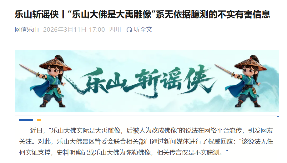 3月11日,乐山大佛景区管委会辟谣称:该说法无任何实证支撑,史料明确记载乐山大佛来源,相关传言仅是臆测。