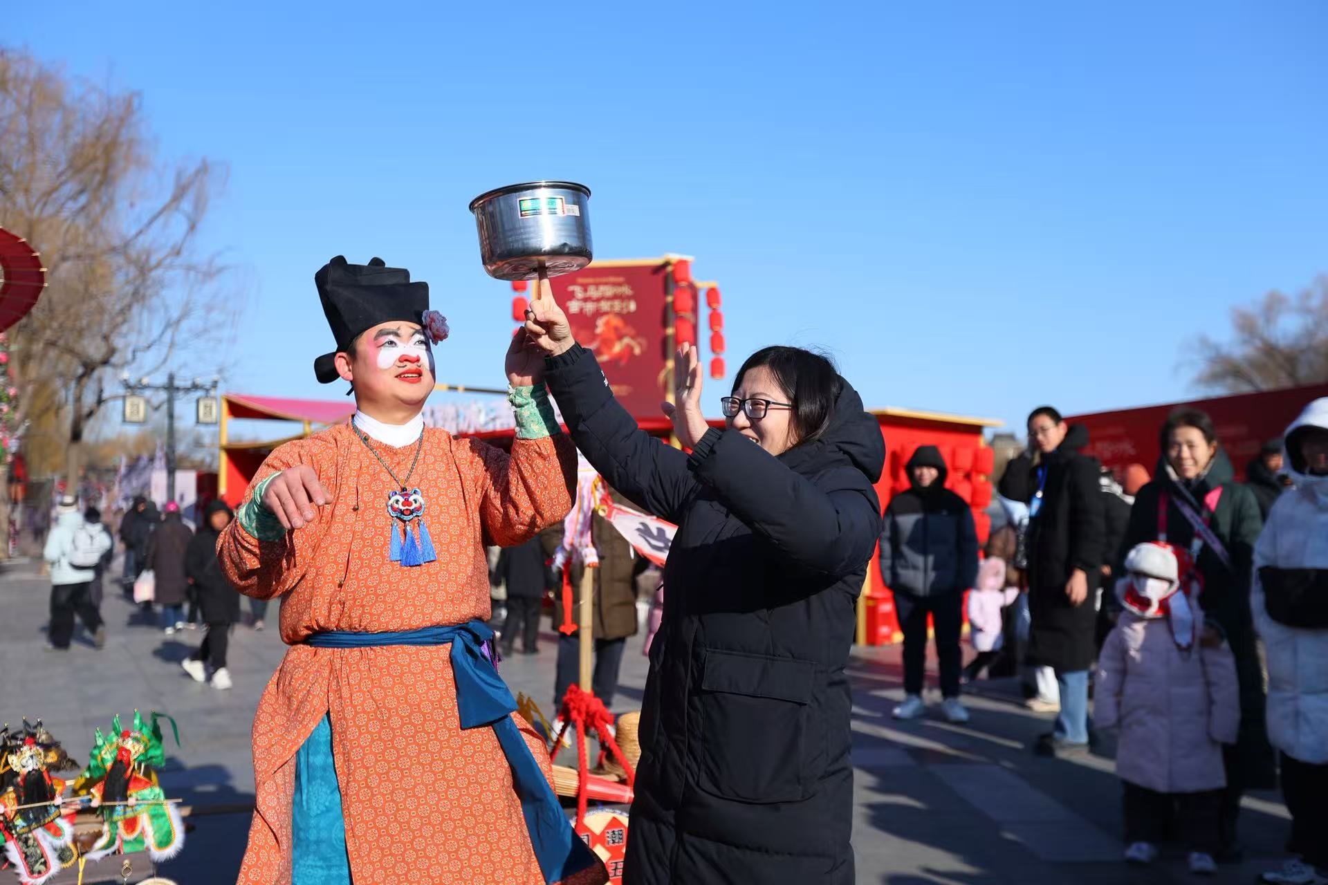 糖葫芦、龙须酥、吹糖人等传统美食一应俱全,六必居、庆云楼、内同兴等京城老字号摊位前更是排起长龙,刚买到糖葫芦的小朋友开心地说:“这个冰糖葫芦又酸又甜,太好吃了!”