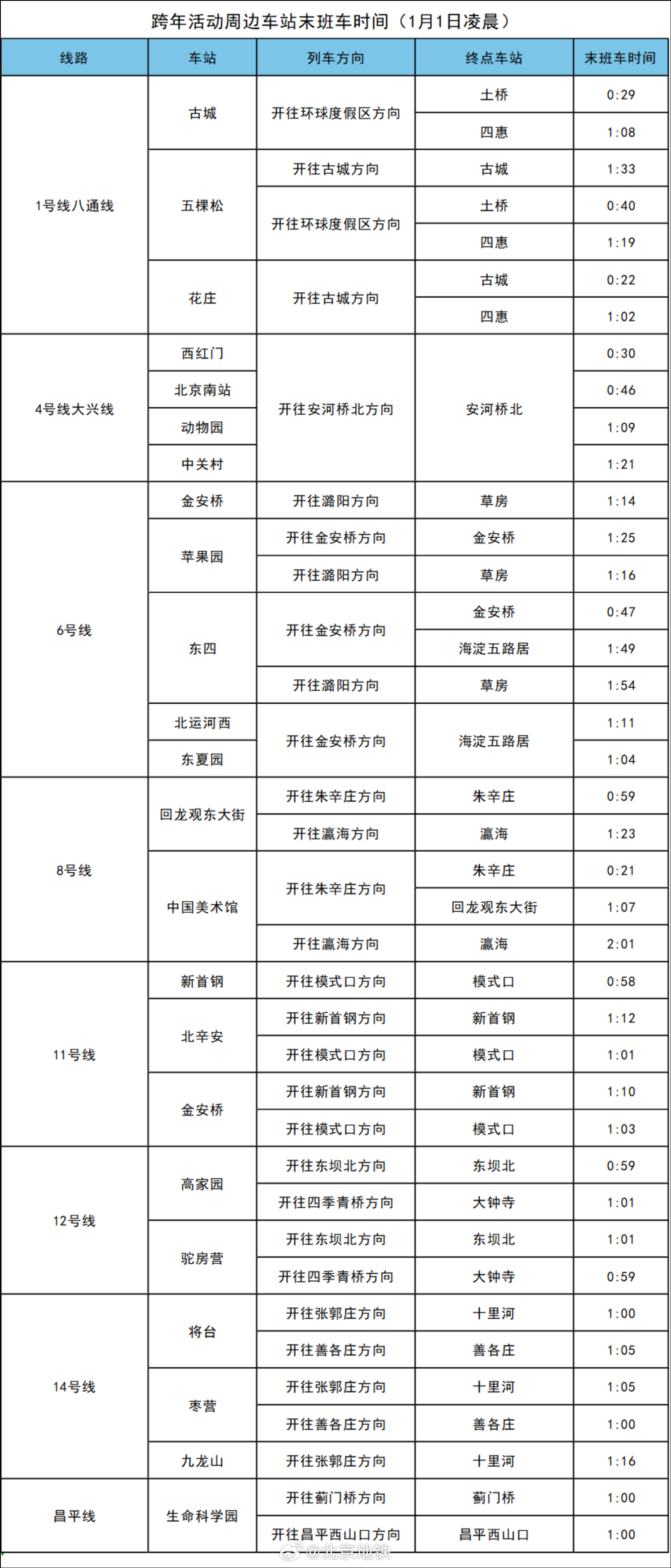 记者今天从北京地铁了解到,为保障跨年活动安全顺利,2025年12月31日地铁1号线八通线、4号线大兴线、6号线、8号线、11号线、12号线、14号线、昌平线部分区段延时运营,具体运营信息如下:
