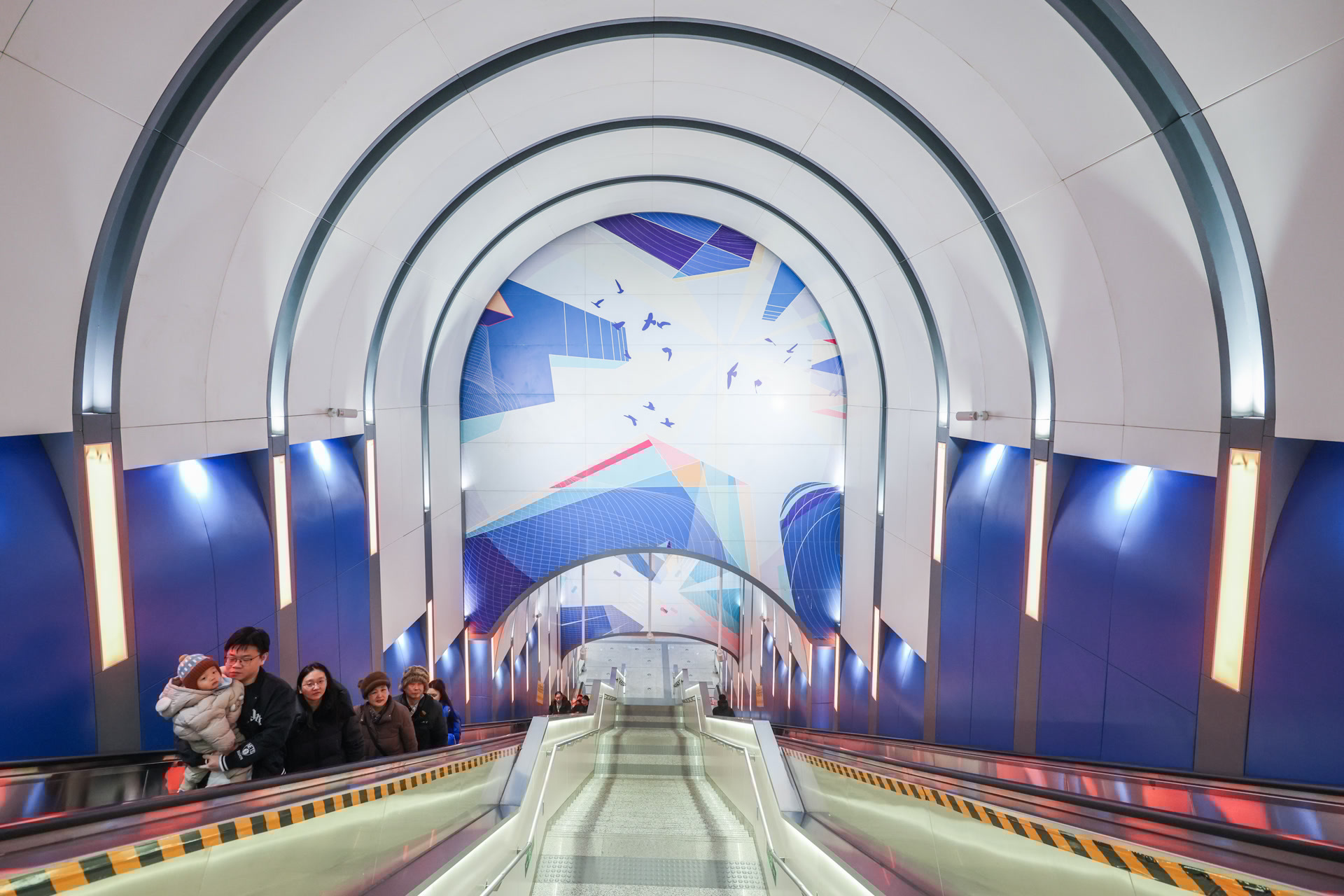 走进新开通的17号线望京西站内,在站厅顶部,一个巨大的“飞碟”悬浮在幽蓝神秘的“宇宙”中,带给人满满科技感。