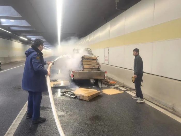 “哗——”水流激射而出,直击火源。马跃航紧握水枪,逼近炙热的车体,浓烟与灼热的气浪扑面而来,他眯着眼,稳稳地压住火势。短短几分钟内,明火被彻底扑灭,一场潜在的灾难化于无形。由于处置及时、专业,事故未造成人员伤亡,隧道交通也很快恢复正常。