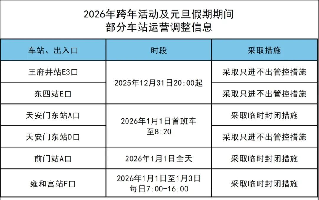 为满足2026年跨年活动及元旦假期期间乘客出行需求,确保乘客平安、顺畅出行,地铁公司对部分线路车站采取“分时段”运营调整措施。