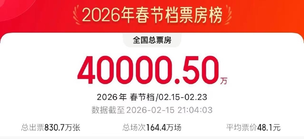 据网络平台数据,2026年春节档档期总票房破4亿。