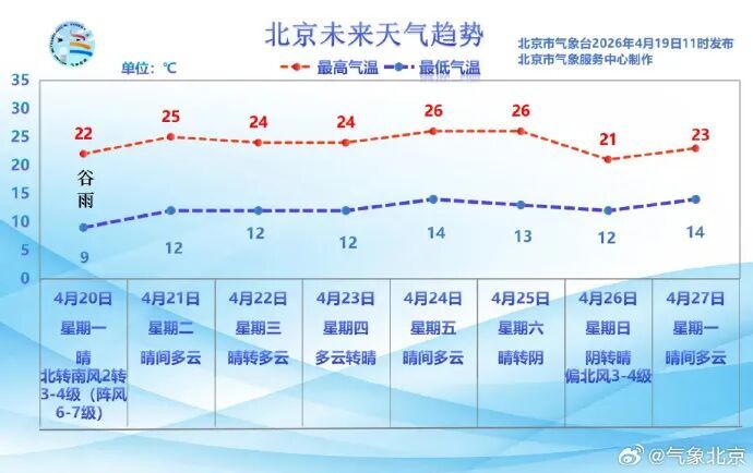 明天迎来谷雨节气,白天天空晴朗,但阵风依旧较明显,户外请适当防风。下周二到周日,以晴到多云为主,午后暖意融融,大部分时间适宜大家踏青赏花。不过,周内依旧不时有3级左右的风出现,提醒大家关注临近预报变化,合理调整出行。