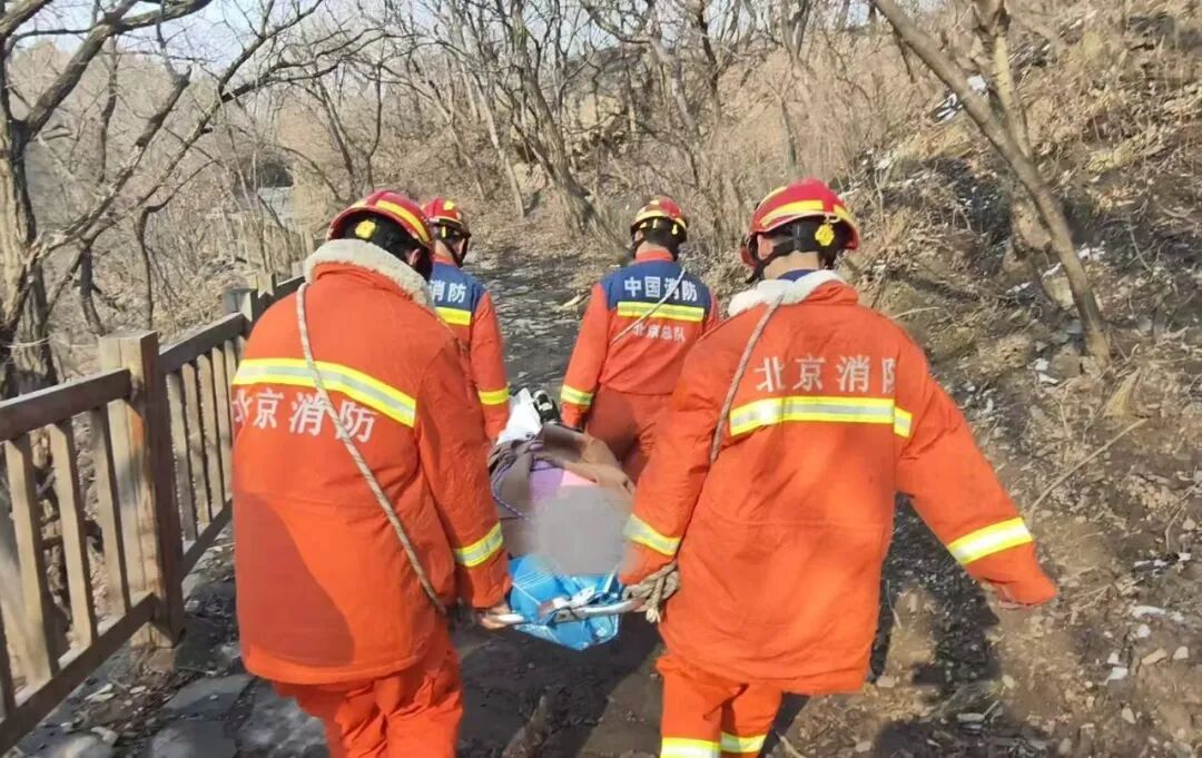 3月8日,14时40分门头沟区永定消防救援站接到120转警:一名四十岁左右的女子在戒台寺后山徒步时不慎摔倒受伤,疑似腿部骨折,无法自行下山,急需消防力量到场协助转运。接警后,消防救援人员立即携带救援装备赶赴现场。