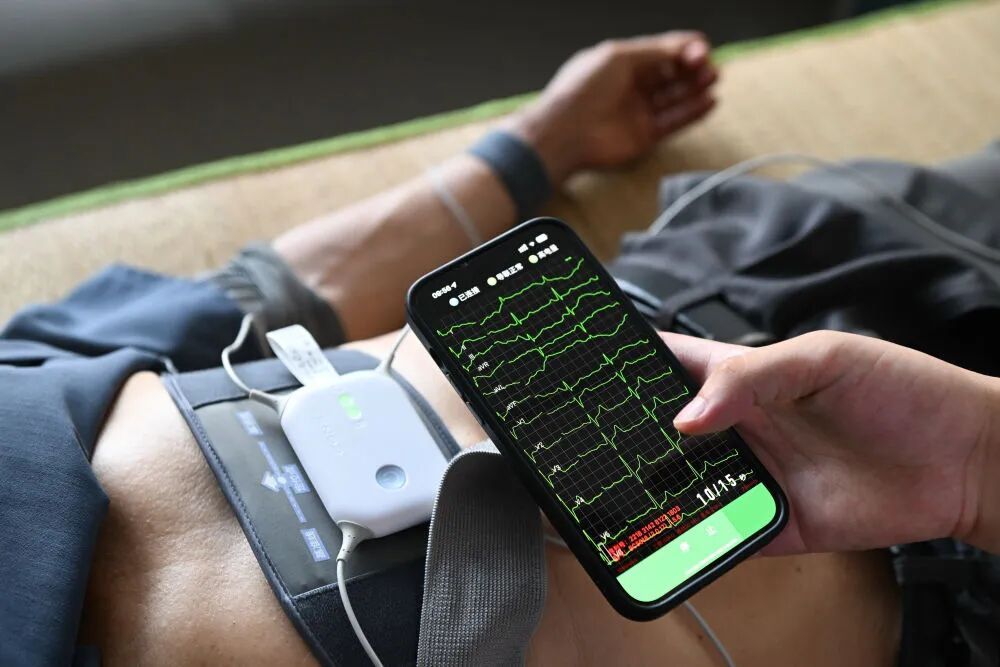 在江苏省海安市曲塘镇刘圩村卫生室,医生为村民进行心电图检查