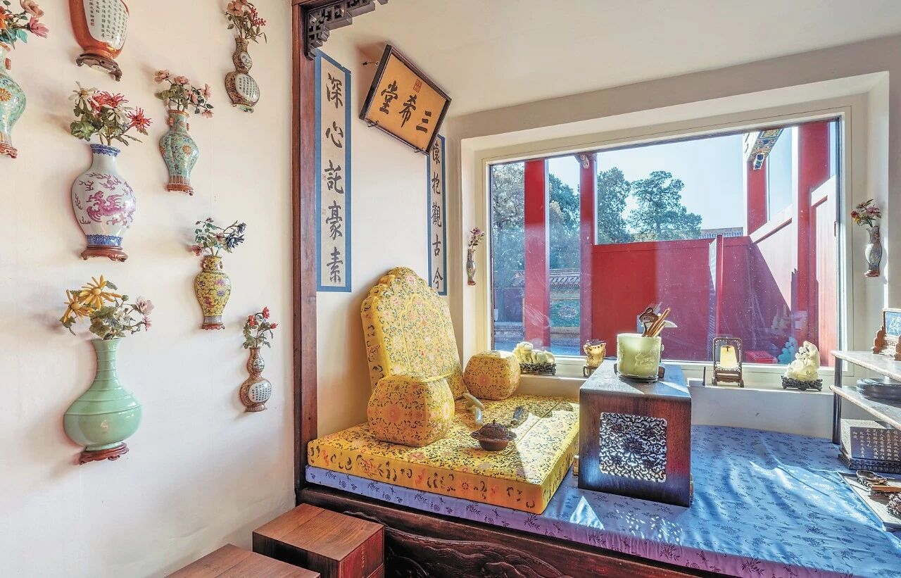 闻名遐迩的三希堂,位于养心殿内西暖阁,原为乾隆的书房,名温室,后因乾隆年间收藏王羲之《快雪时晴帖》、王献之《中秋帖》、王珣《伯远帖》三件稀世墨宝而得名,“三希”亦含“士希贤、贤希圣、圣希天”的修身箴言。透过明亮的玻璃,观众可以看到,堂内墙上还悬挂着各式瓷瓶,瓶中插有宝石花。