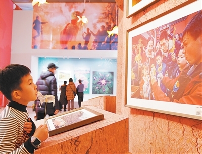 在中国非物质文化遗产馆举行的展览现场,小朋友被一幅摄影作品吸引。新华社记者 金立旺