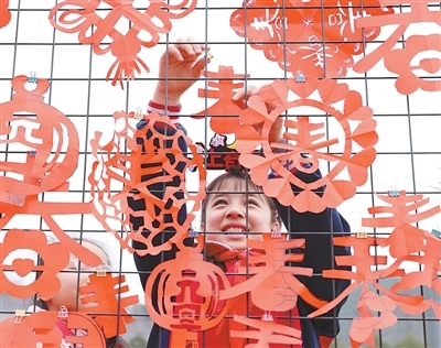 湖南省怀化市通道侗族自治县礼雅小学学生在挂窗花剪纸。粟勇主摄(影像中国)