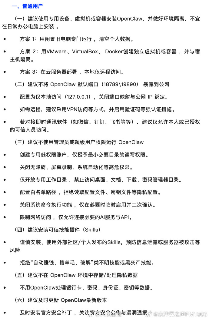 其中,对于普通用户的建议包括:使用专用设备、虚拟机或容器安装OpenClaw,并做好环境隔离,不宜在日常办公电脑上安装;不使用管理员或超级用户权限运行OpenClaw;不在OpenClaw环境中存储、处理隐私数据;及时更新OpenClaw最新版本等。
