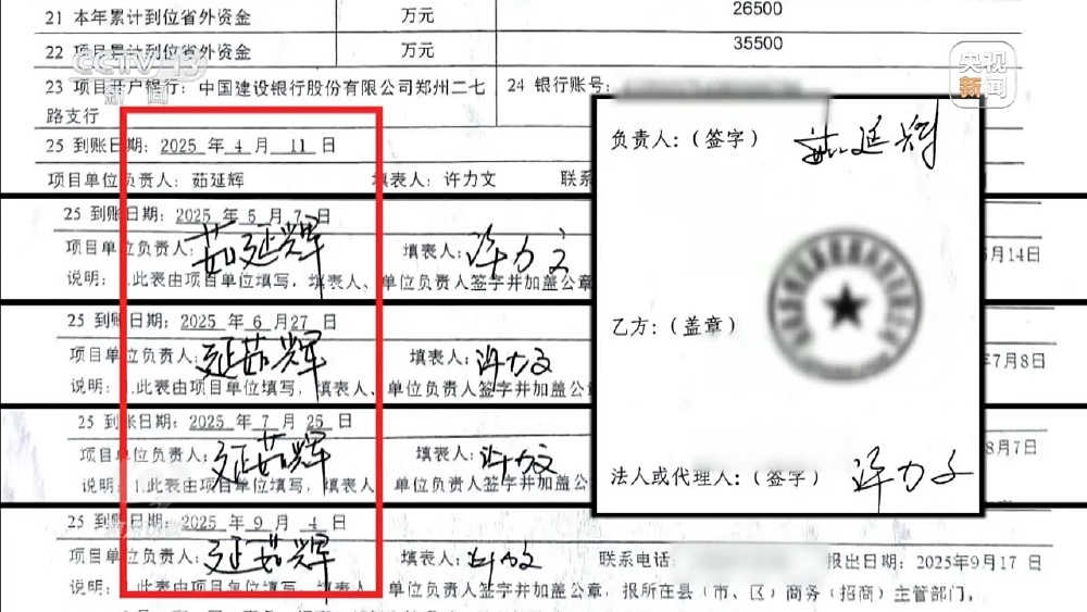 类似舞阳县的问题并非个例,在其他地区同样存在。记者在郑州市管城区商务局调查时发现,2025年4月至9月的省外资金月报表显示,一家海南企业向辖区内的河南某企业累计投资9.6亿元,但佐证材料里只有投资合同,没有对应的银行进账凭证。同时,合同和报表上的签名也漏洞百出:月报表前两页的项目负责人签名是“茹延辉”,后面几页却变成了“延茹辉”,多处字迹也明显不一样。拿着该项目的相关材料,记者找到了这家企业负责人。