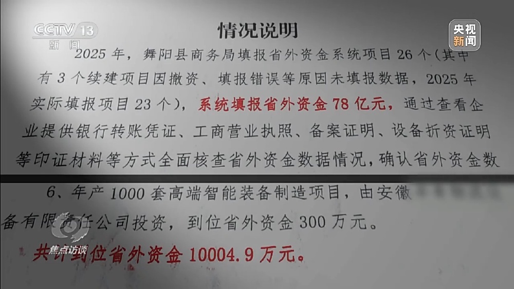 省外资金,简单来说就是从本省以外地区引进来的投资资金。2000年前后,我国多地开始将引进省外资金作为推动区域发展的重要抓手,一些省份将引进省外资金作为加快发展的关键举措,开始建立省外资金统计通报与排名机制,省际围绕项目、资源、政策展开激烈竞争。在这一过程中,部分地方出现了省外资金统计严重失真失实的情况。2025年1月到11月,河南省漯河市舞阳县上报省外到位资金78亿元,但当记者调查时,当地承认实际到位金额仅为1亿多元。