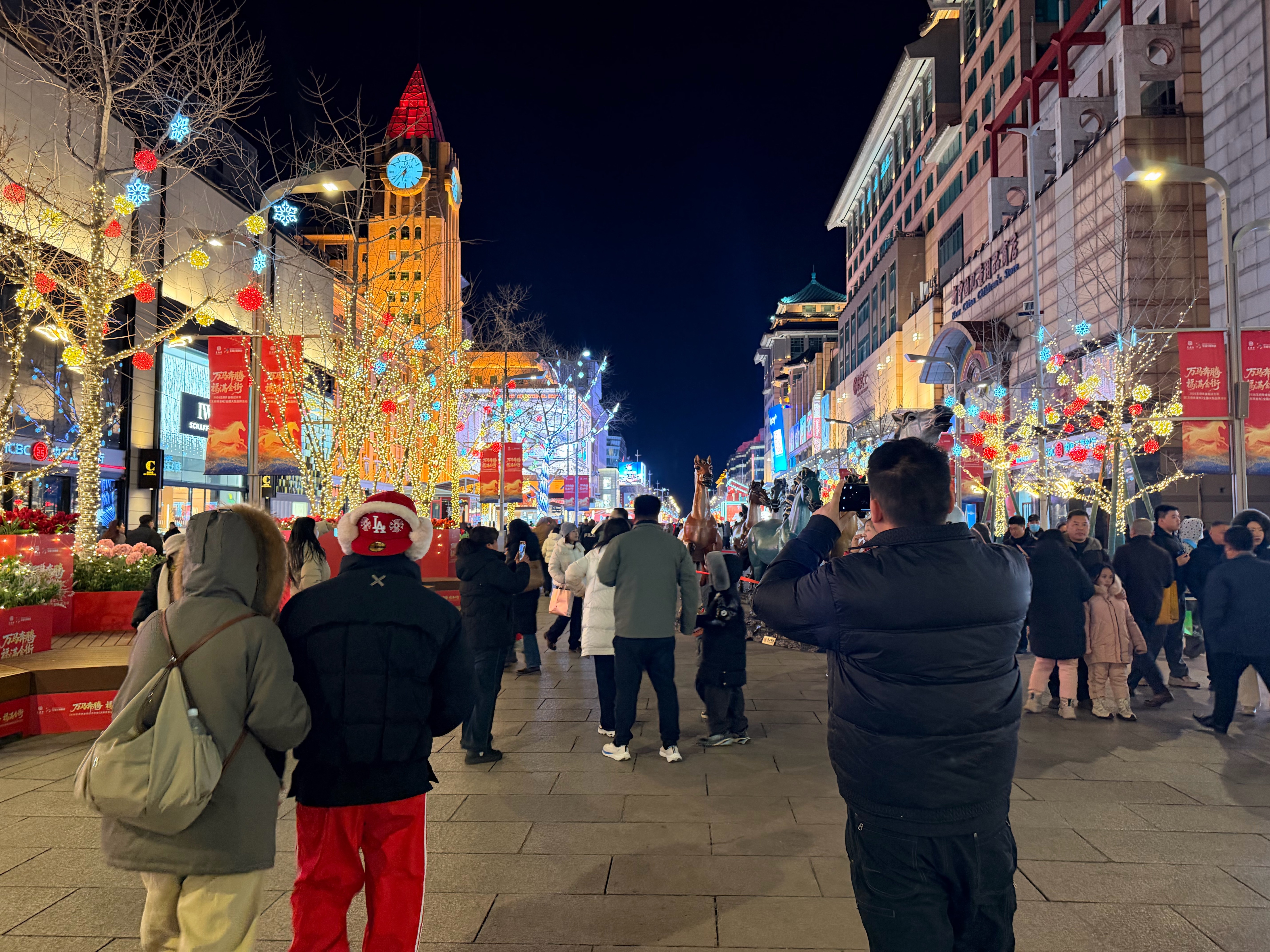 王府井北街则为游人带来一场融合未来科技、国潮文化与地道风味的沉浸式新年之旅。“这可是国家级赛事的限定装备!”在国航文创与中国国家队特许零售店,航空爱好者小凡正看着一架飞机模型两眼放光,央求父母为他买下,父母也兴致勃勃地听着孩子给自己“科普”。