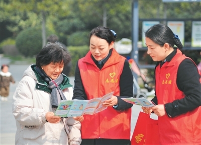 3月14日,江苏省徐州市睢宁县邮政分公司的工作人员在睢城街道红叶社区,向居民普及电信网络诈骗防范、个人信息保护等知识。洪星摄(人民视觉)