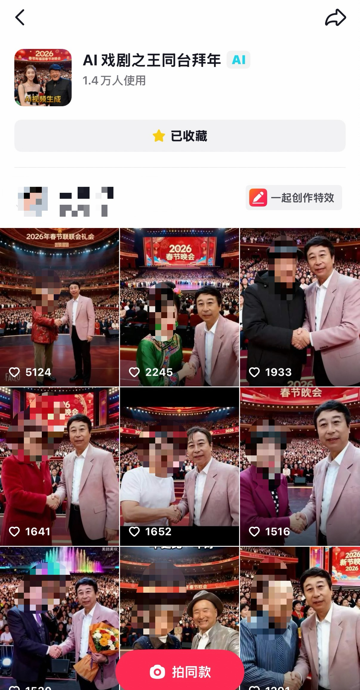 一种AI春晚特效,就颇受中老年网友欢迎。记者体验点击“拍同款”,上传一张自己的照片,便轻松将自己合成进一个模拟“2026年春节晚会”的舞台场景,和众多知名主持人、明星嘉宾一一握手,并互相问候“新年好”。