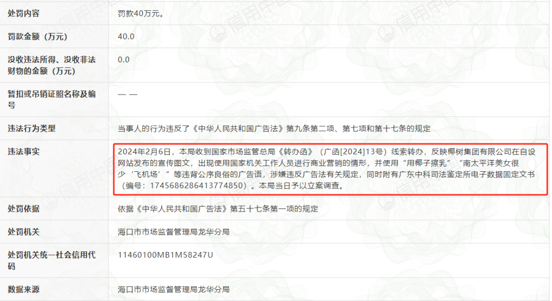 椰树集团招聘广告因“妨碍社会公共秩序或者违背社会良好风尚”被罚款40万元。
