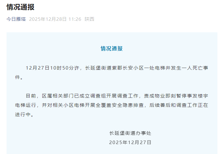 12月28日,陕西西安雁塔通报一小区电梯井发生一人死亡事件:已成立调查组开展调查工作,详情如下: