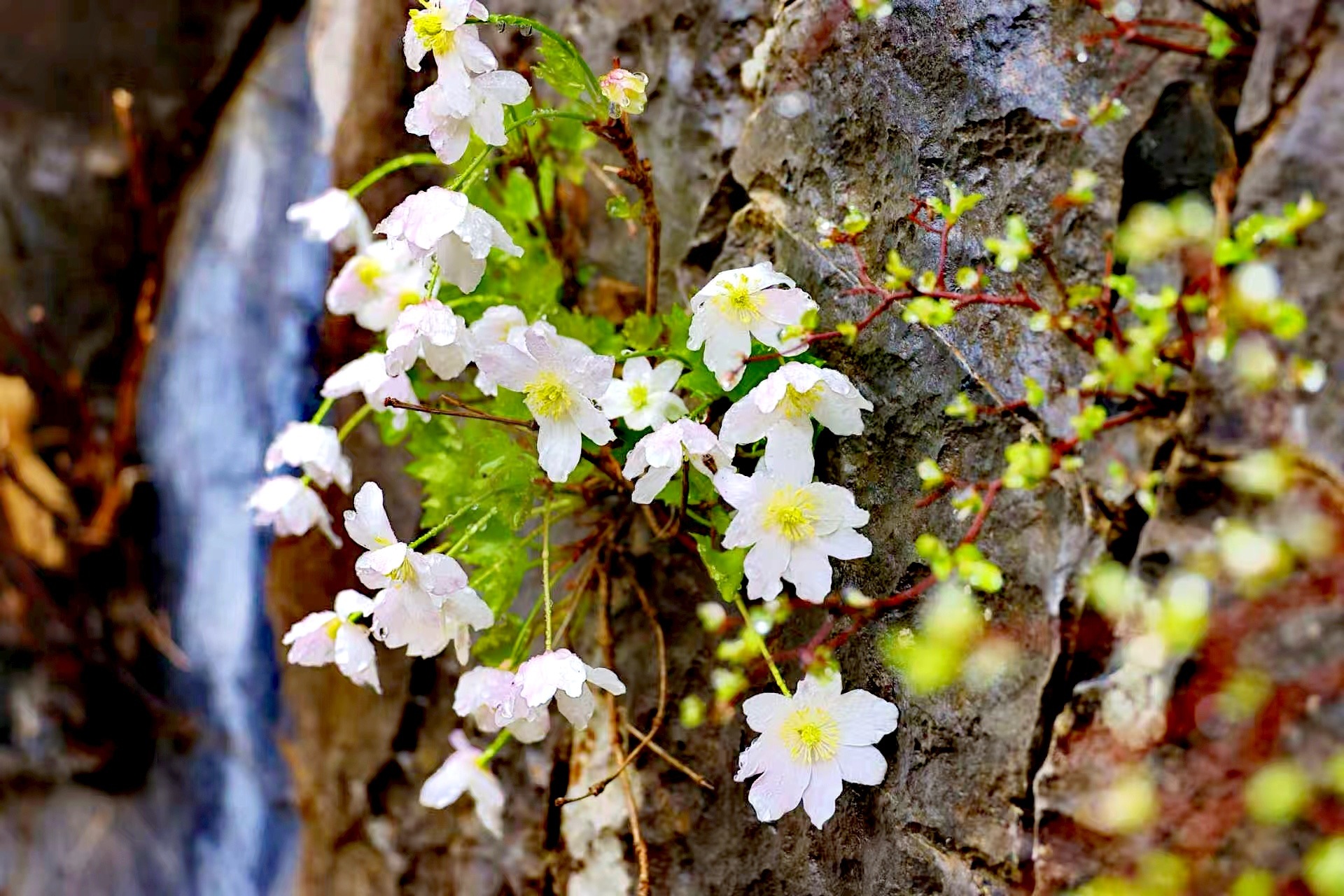 在摄影师传来的高清画面中,陡峭的岩壁虽寸草难生,却成了这两大精灵的专属舞台。镜头里,槭叶铁线莲的洁白花簇从坚硬的岩缝中垂落而下,如同白云栖息在石壁之上,轻盈飘逸。作为国家二级保护野生植物,槭叶铁线莲是地道的“北京土著”。它对生存环境极为挑剔,只肯在石灰岩悬崖上安家,是京西春日里最具代表性的野生花卉。