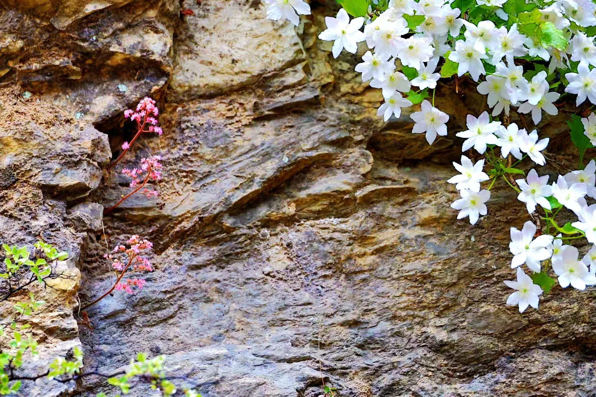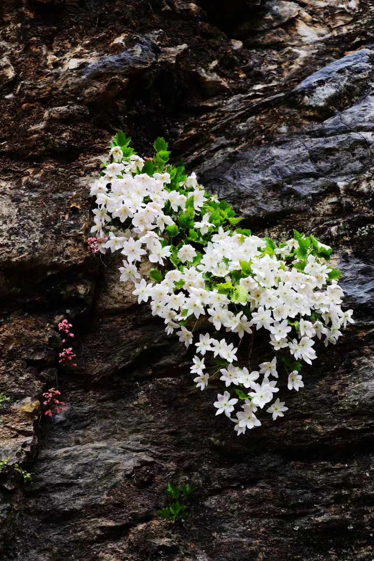 与之相伴的独根草,仅凭一根看似柔弱的茎,硬是在荒芜的石壁上撑起了一团粉色的烟霞。这种中国特有的岩生植物,遵循着“花叶永不相见”的生长规律,先开花后长叶,在贫瘠中迸发出顽强的生命力,被植物爱好者称为崖壁间最动人的“孤勇者”。