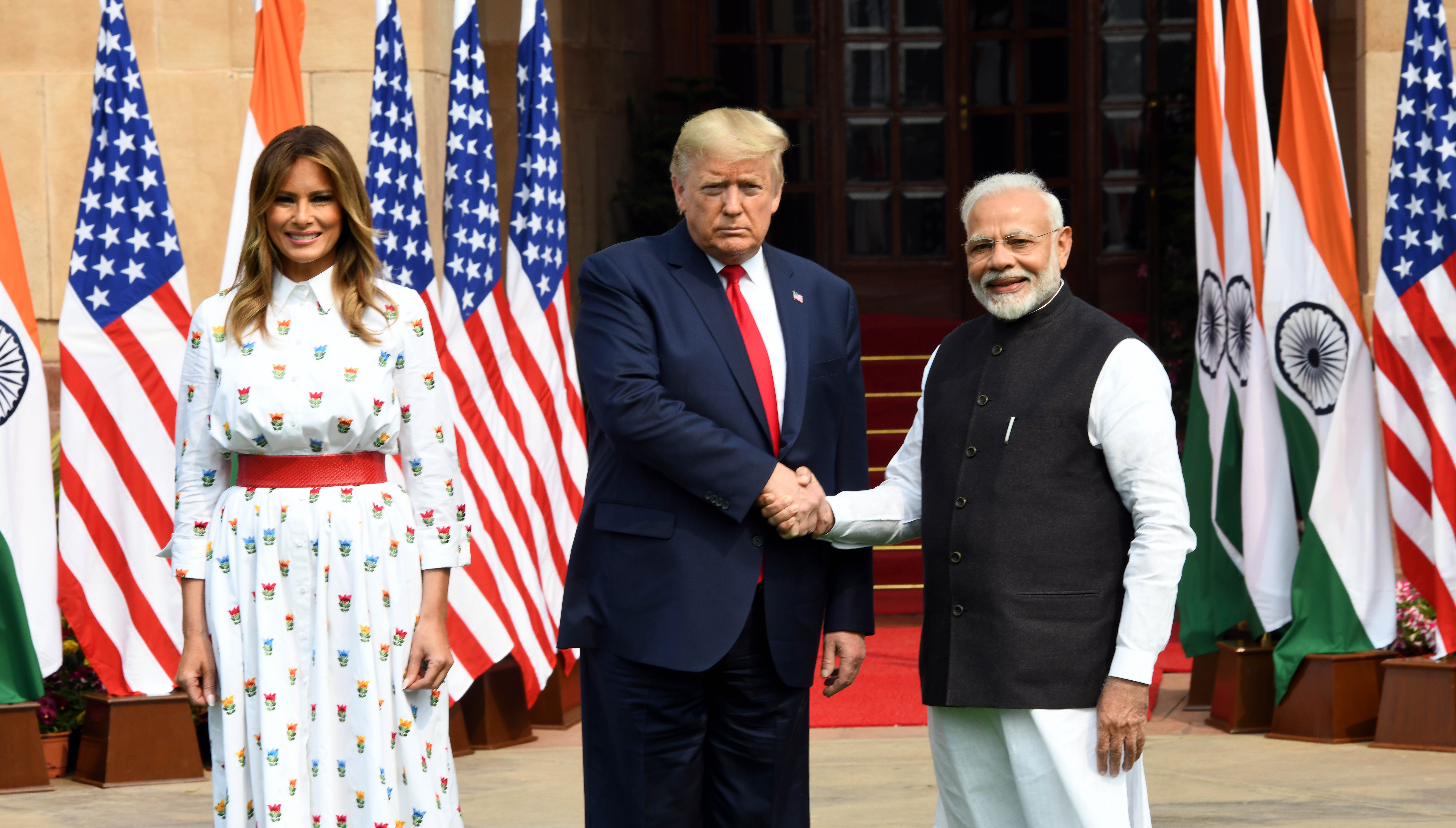2020年2月25日,在印度新德里,到访的美国总统特朗普(中)与印度总理莫迪在举行会谈前握手。新华社发(帕塔·萨卡尔摄)