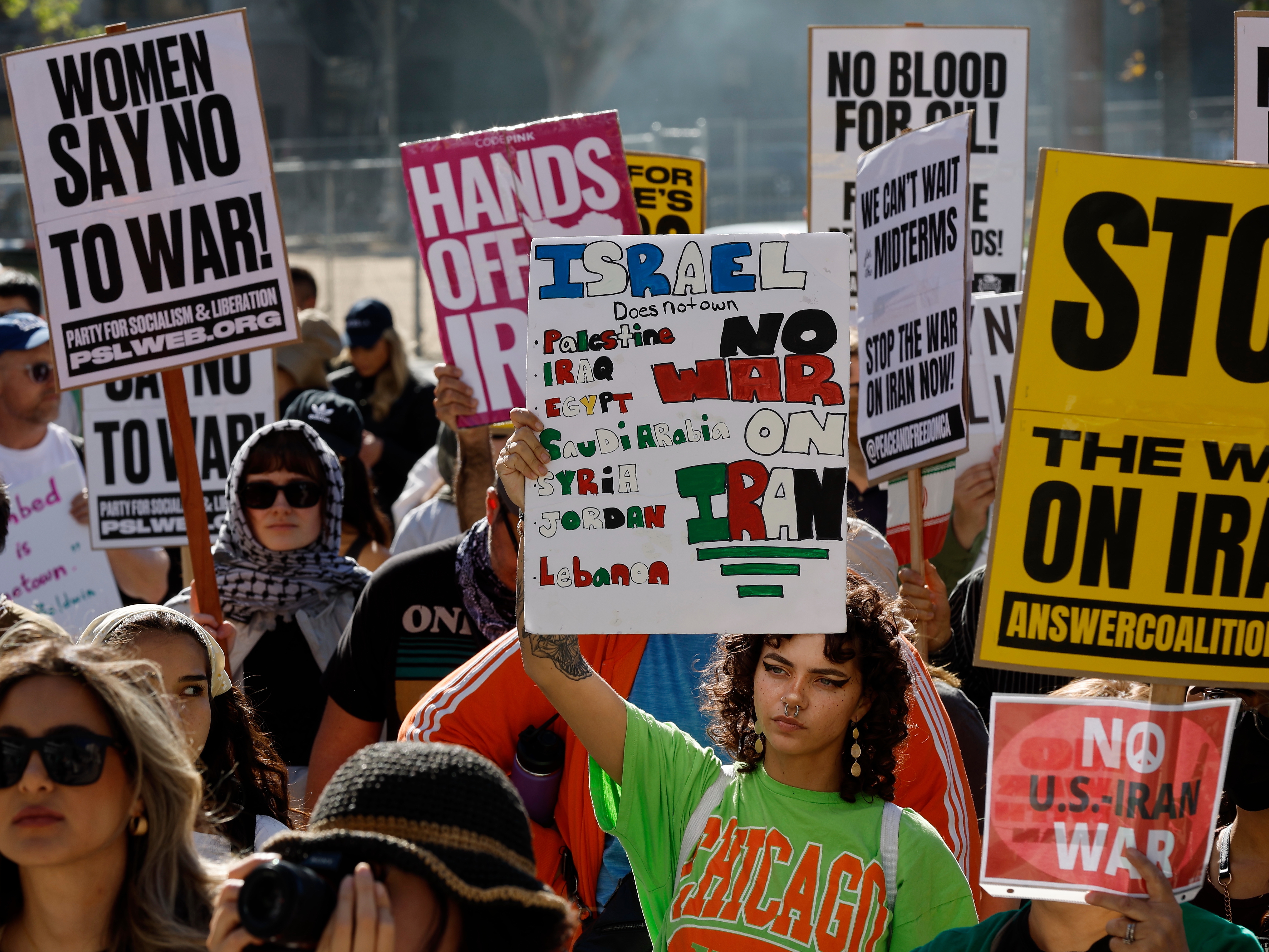 3月7日,在美国加利福尼亚州洛杉矶市政厅前,人们参加集会,抗议美国和以色列对伊朗发动军事打击。