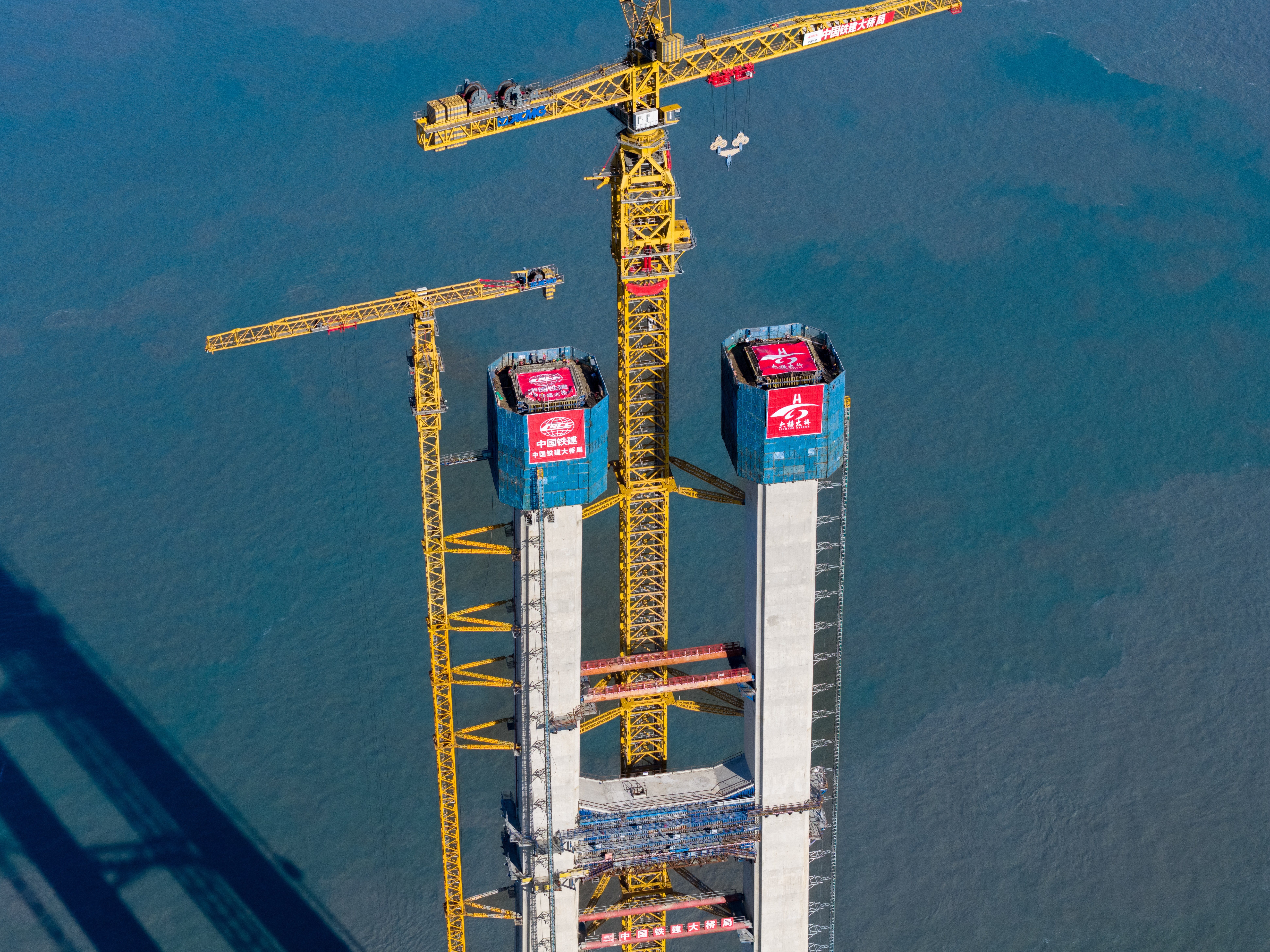 图为双屿门特大桥首个主塔封顶施工现场。(中国铁建大桥局供图)