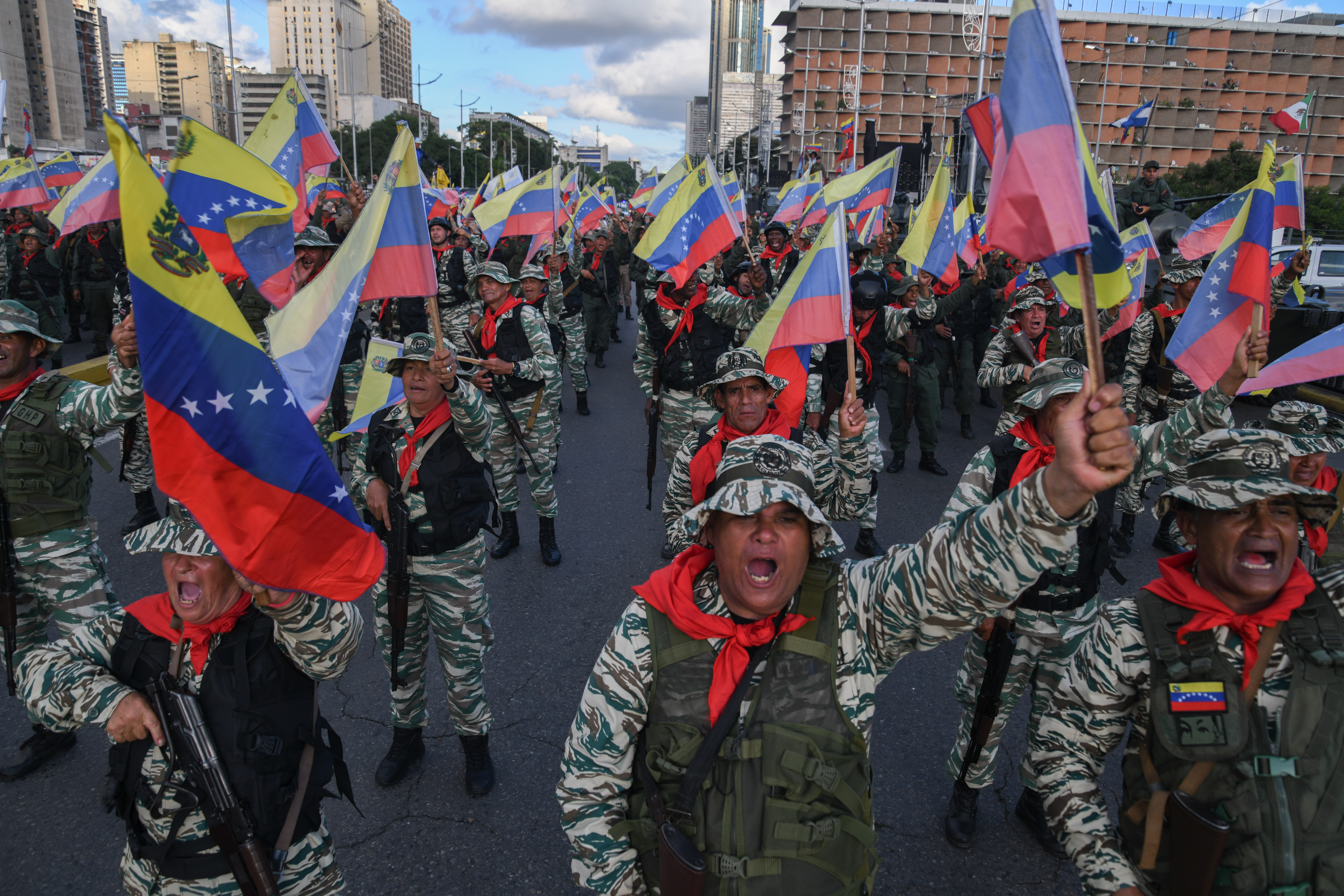 9月23日,在委内瑞拉首都加拉加斯,民兵组织成员挥舞委内瑞拉国旗参加游行,呼吁保卫委内瑞拉主权与和平,反对美国在加勒比海域的军事威胁。新华社发(马科斯·萨尔加多摄)