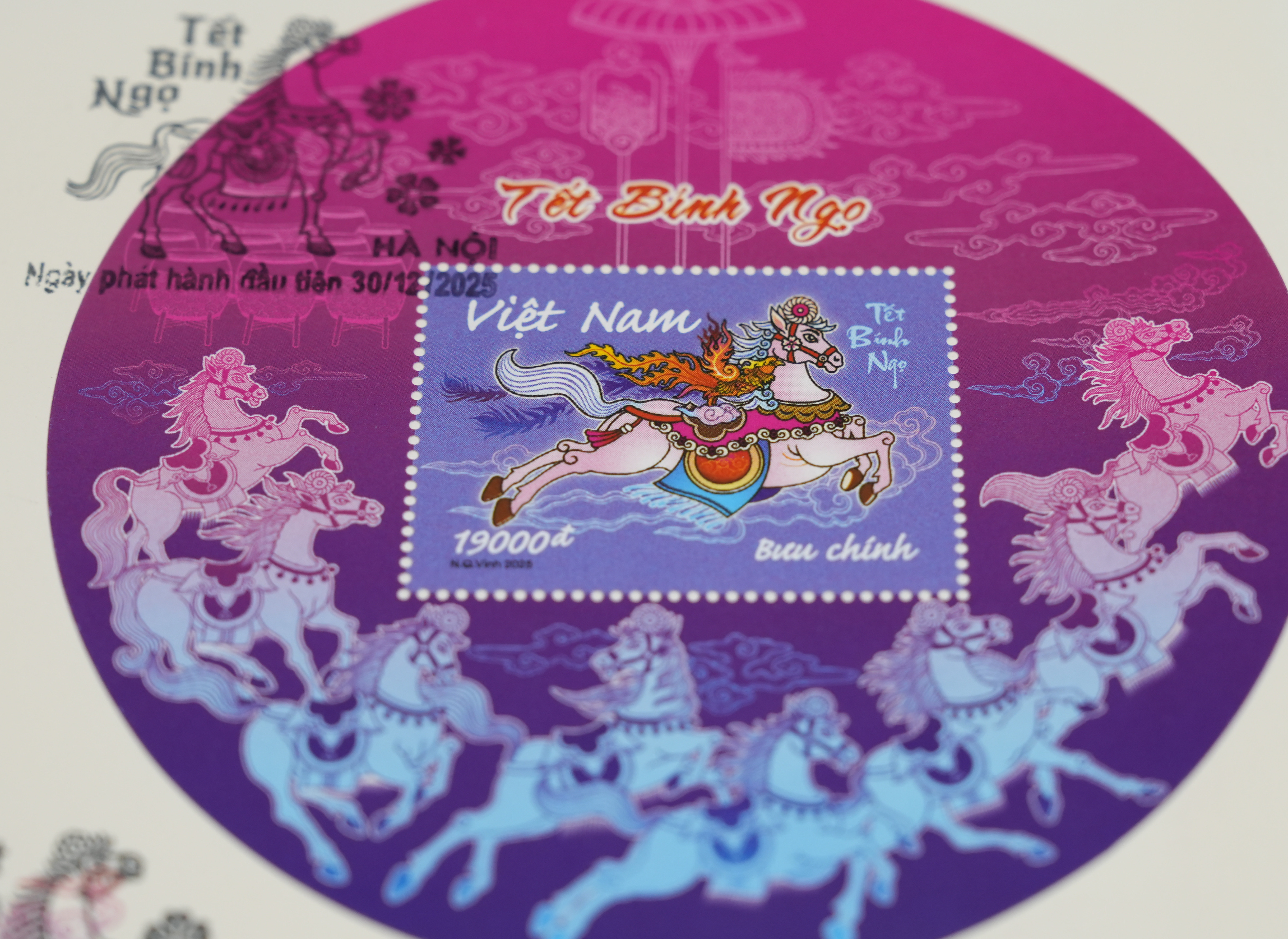 为迎接农历新春,越南近期发行了两枚邮票及一枚小型张等邮品,图案融入了当地民俗。邮票上,红色公马和白色母马披挂盛装,驮着乐鼓,轻抬前蹄。设计本轮生肖邮票的越南画家阮光荣介绍道,两枚邮票上的马,呈双马相对的构型,“完整的乐鼓阵是春节必备,人们擂鼓助兴,喜迎新年”。