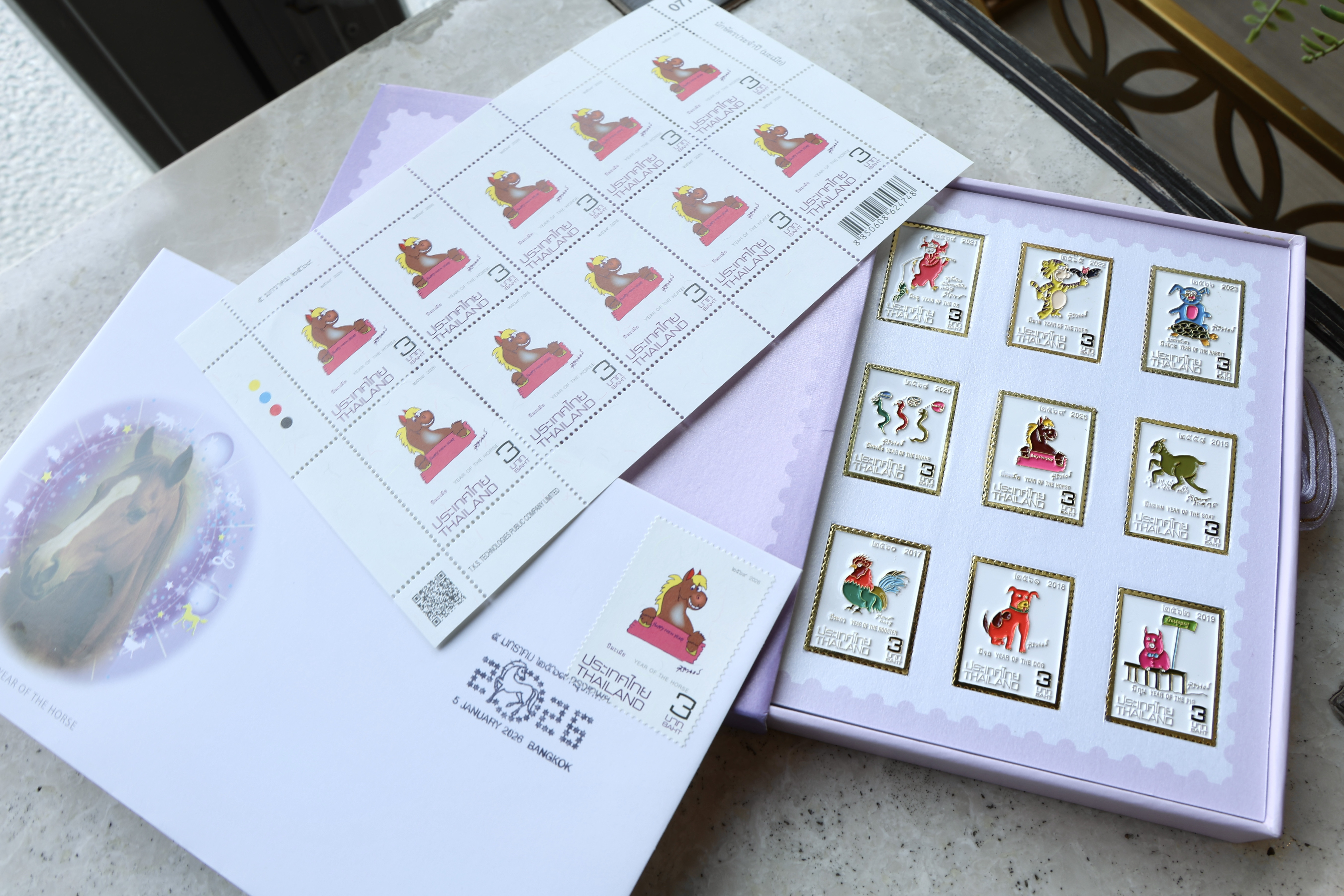 在泰国,马年生肖邮票依旧由诗琳通公主亲自设计。马的形象俏皮可爱,笔触充满童趣。泰国邮政同时推出一套涵盖6个属相的小全张。