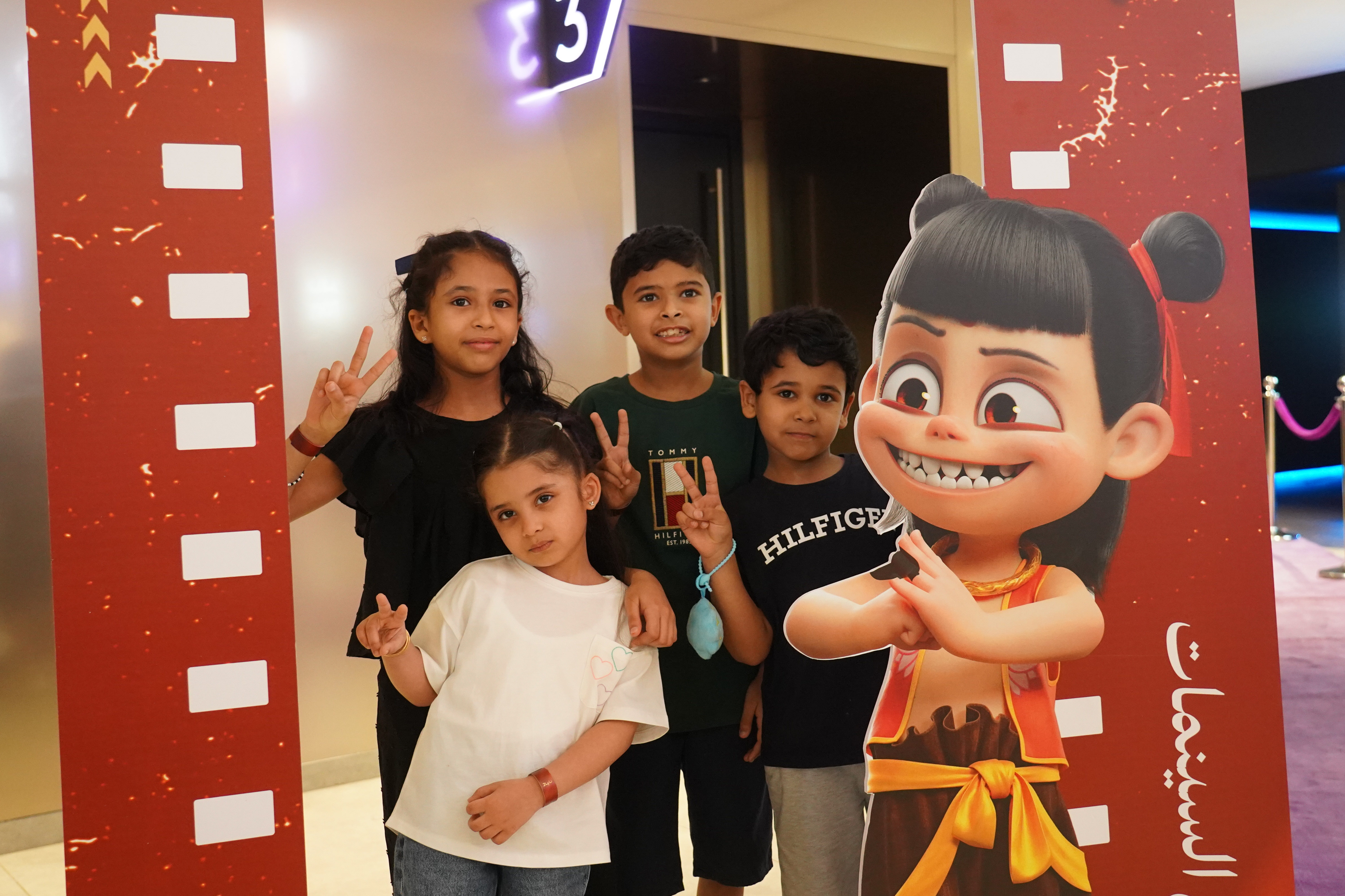 6月25日,在沙特阿拉伯利雅得,观众在《哪吒之魔童闹海》的宣传展板拍照留念。(新华社记者王海洲摄)