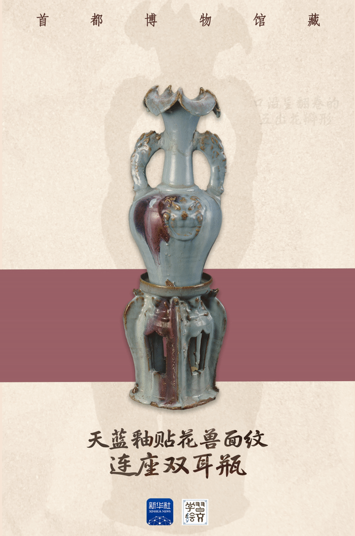 此瓶由上下两部分组成,上为瓶、下为座,瓶、座相接。瓷瓶通体施天蓝色釉,器身呈现多处不规则的紫红色、蓝褐色斑纹,更显绮丽多彩。