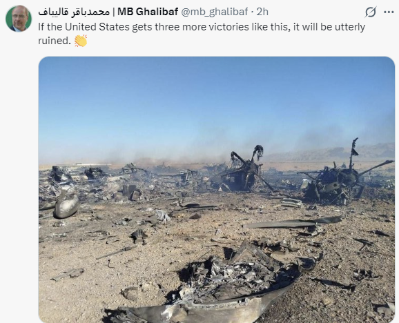 伊朗学生通讯社等伊朗媒体此前发布相同照片,称照片中的是参与救援行动的美国军机残骸。有伊朗媒体称,卡利巴夫此次发帖意在嘲讽美国总统特朗普宣称的“想象中的胜利”。多家伊朗媒体当天发布被击落的参与救援行动的美国军机残骸照片和视频。