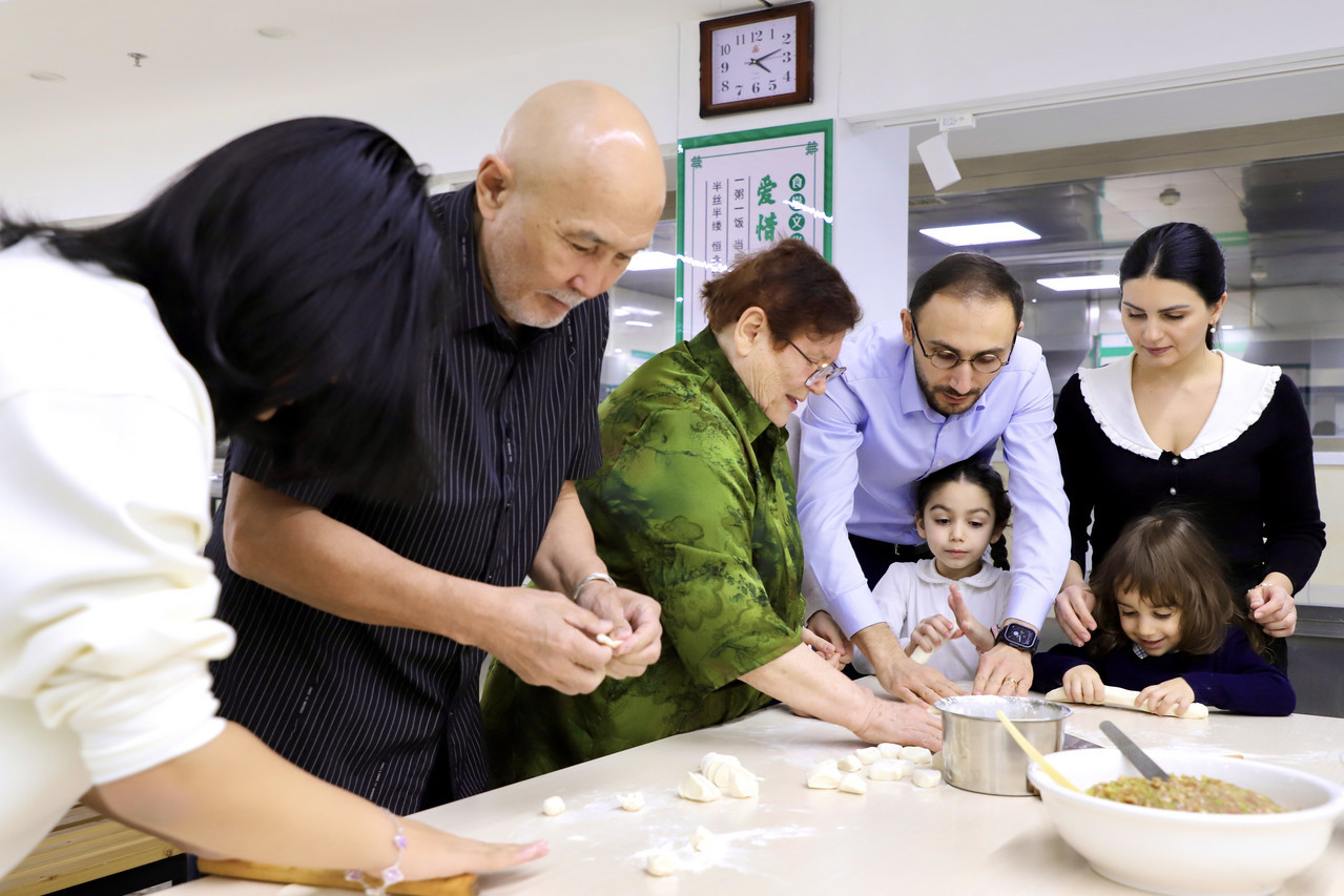为了庆祝春节,医院专门在医院食堂组织医生和家人们开展了一场“国际包饺子活动”。台面上,别克和爱人董明霞手上的活儿最为麻利,揉面、揪剂子、擀皮、包饺子,配合流畅。莉莉娅则拿出了自己的“看家绝活”——土豆泥馅饺子,想着请中国的同事们品尝。萨内萨尔和妻子正照着别克家的工序“照葫芦画瓢”,一旁的三个孩子则开始相互往对方脸上抹面粉。