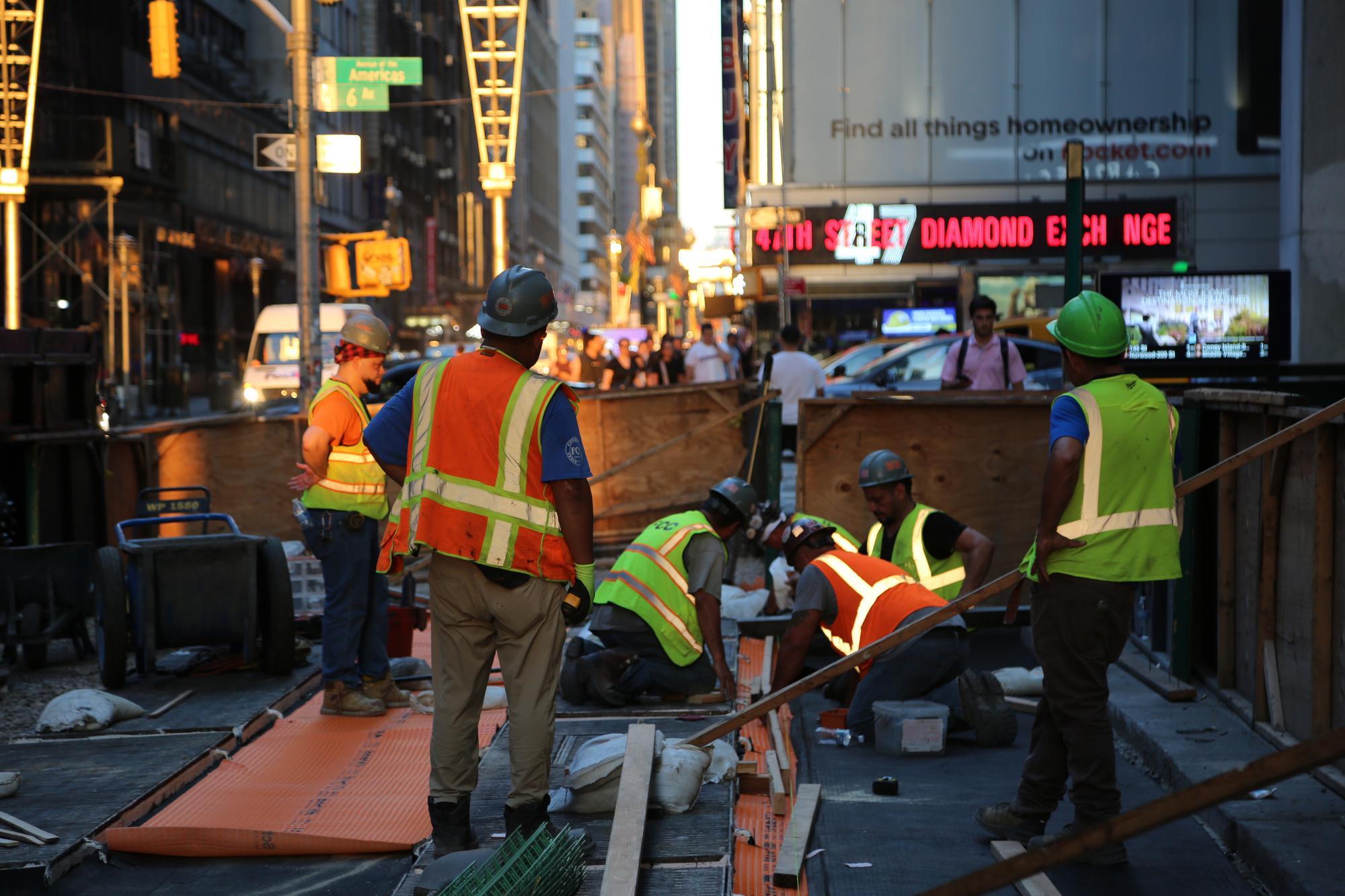 6月24日,建筑工人在美国纽约曼哈顿街头工作