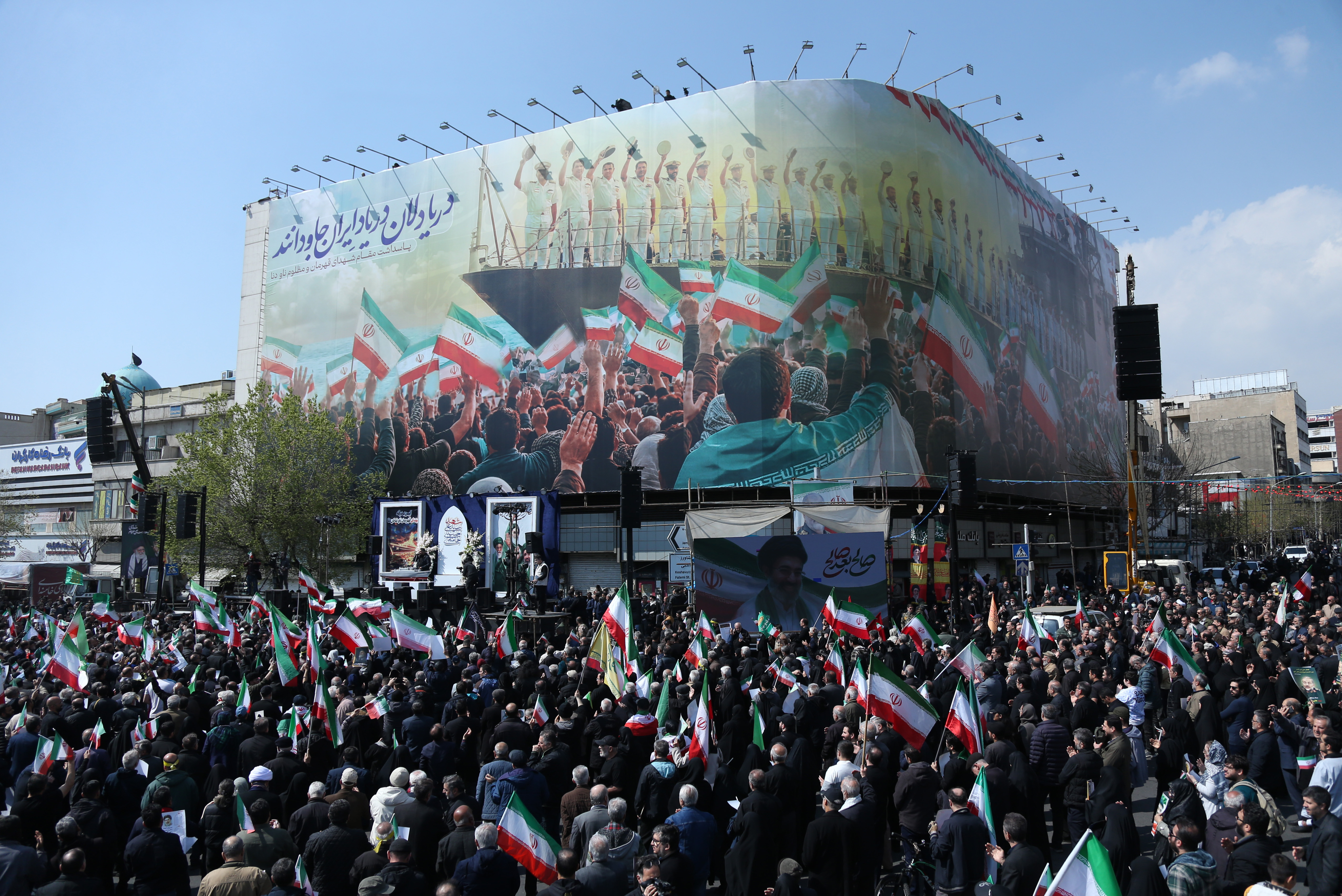 3月18日,伊朗民众在首都德黑兰的革命广场参加葬礼,悼念被美军击沉伊朗军舰上的遇难官兵,以及在以色列发动的袭击中遇害的伊朗安全官员和军事指挥官