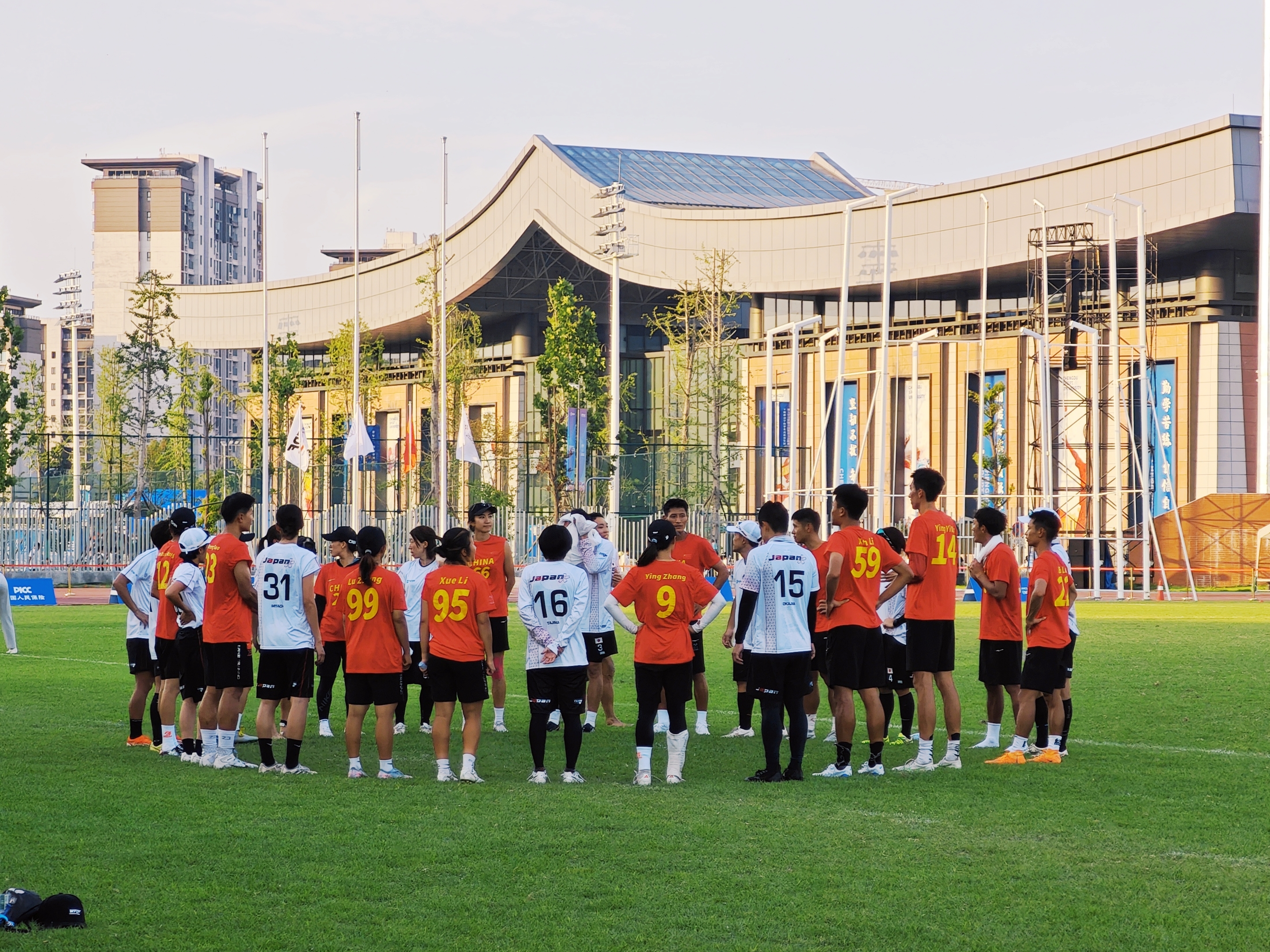 成都世运会中国队与日本队比赛结束后,进行了一个团队飞盘项目特有的仪式:两队队员间隔站立,肩搭肩围成一个圈,分享比赛感受。