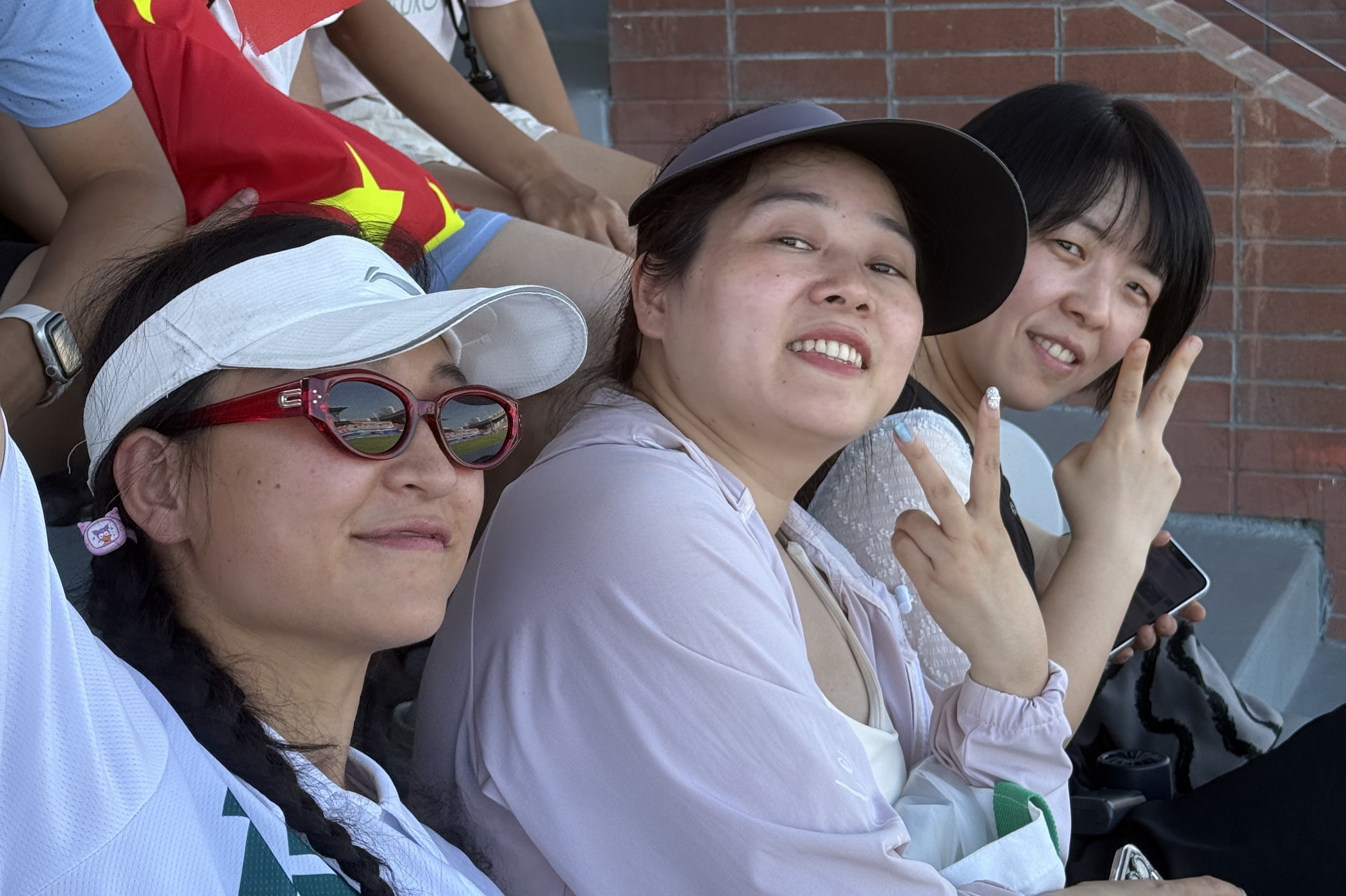 罗霄(中)和彭宇(左一)观看成都世运会飞盘比赛