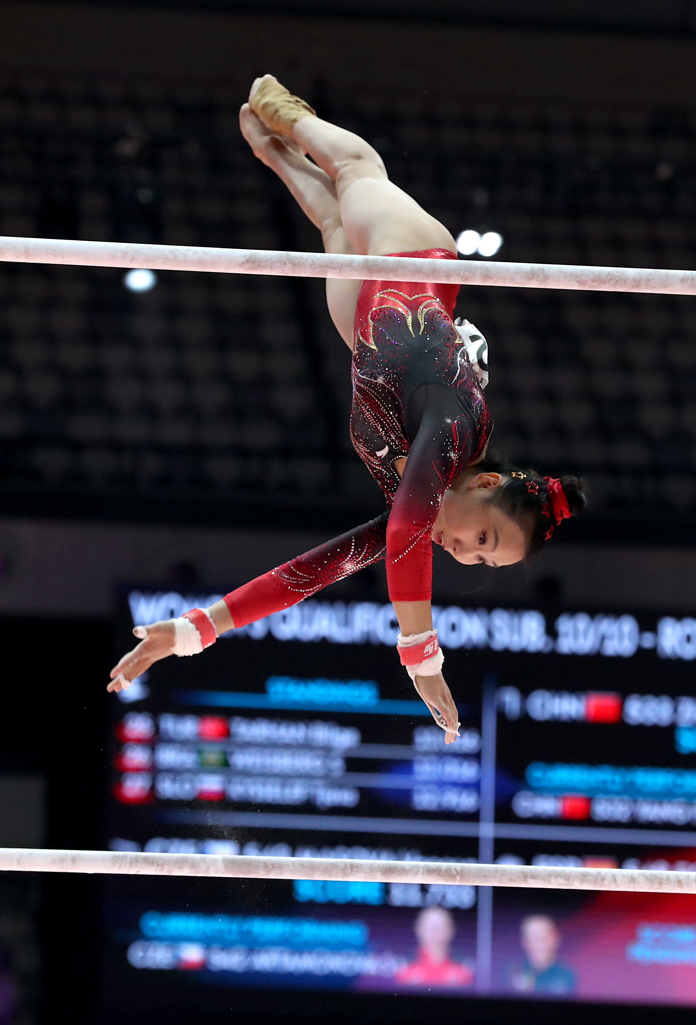 10月21日,中国选手张清颖在高低杠项目比赛中。