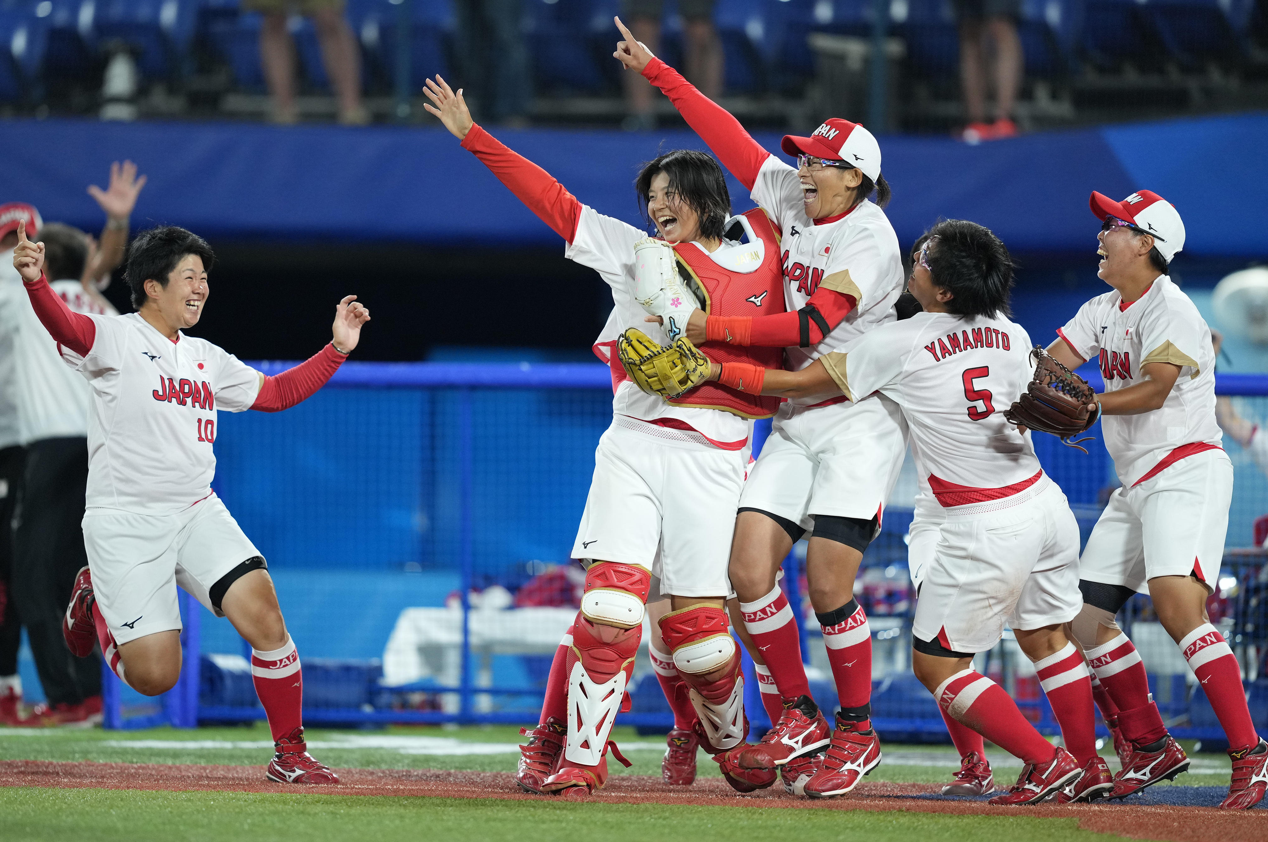 2021年7月27日,日本队队员在决赛后庆祝。当日,在东京奥运会垒球决赛中,日本队以2:0战胜美国队,获得冠军。新华社记者 薛玉斌 摄