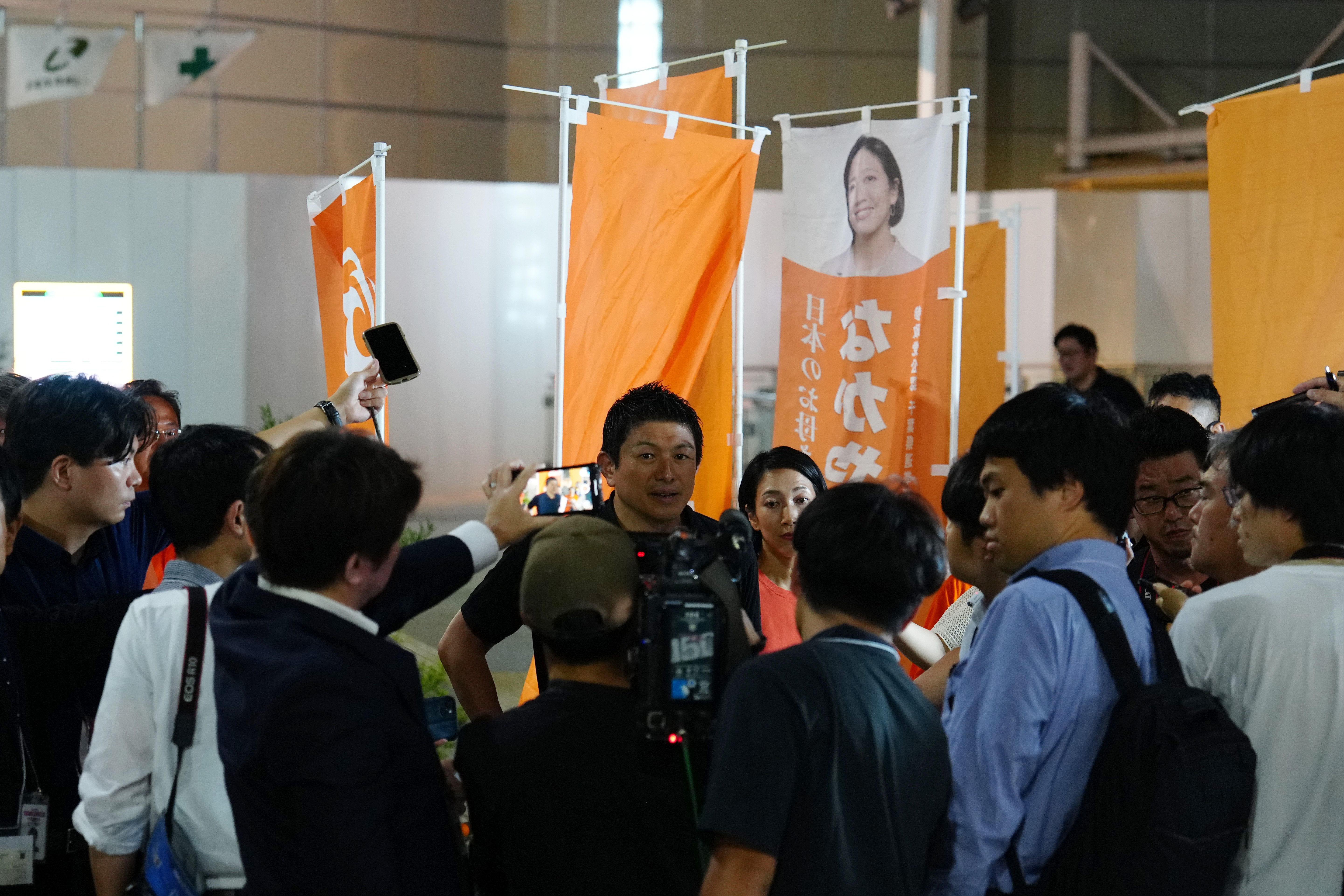 7月13日,在日本千叶县,参政党党首神谷宗币(中)在街头演说活动后接受媒体采访。新华社记者贾浩成摄