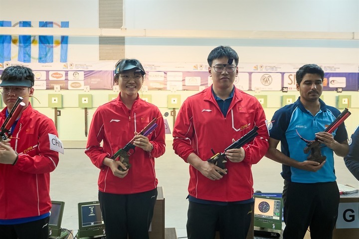 阿根廷站10米气手枪混合团体冠军张益梵(右二)/马千珂(右三)在比赛现场。图片来自国际射联官网