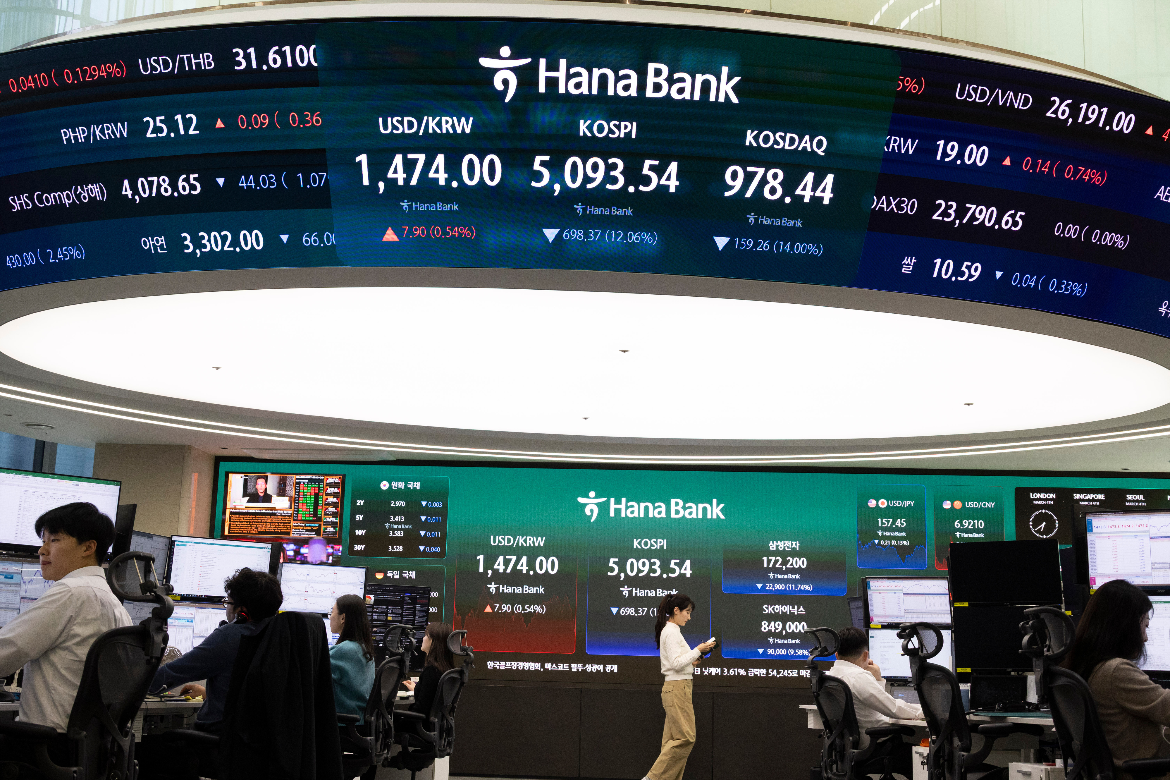 3月4日,银行职员在韩国首尔一家银行的股指大屏前工作。新华社发(全休相摄)