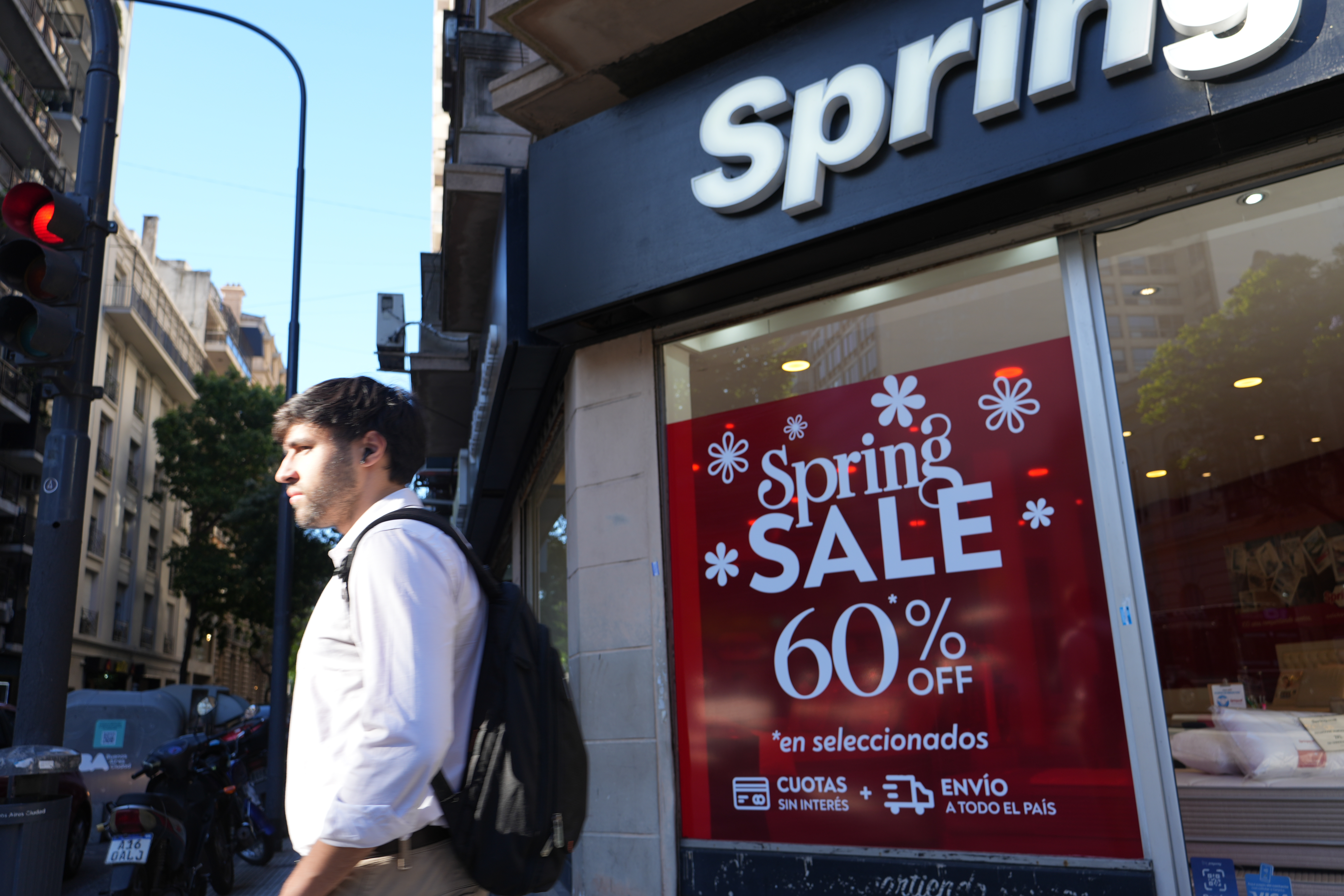 11月14日,市民从阿根廷首都布宜诺斯艾利斯的一家家具店前走过。新华社记者张铎摄