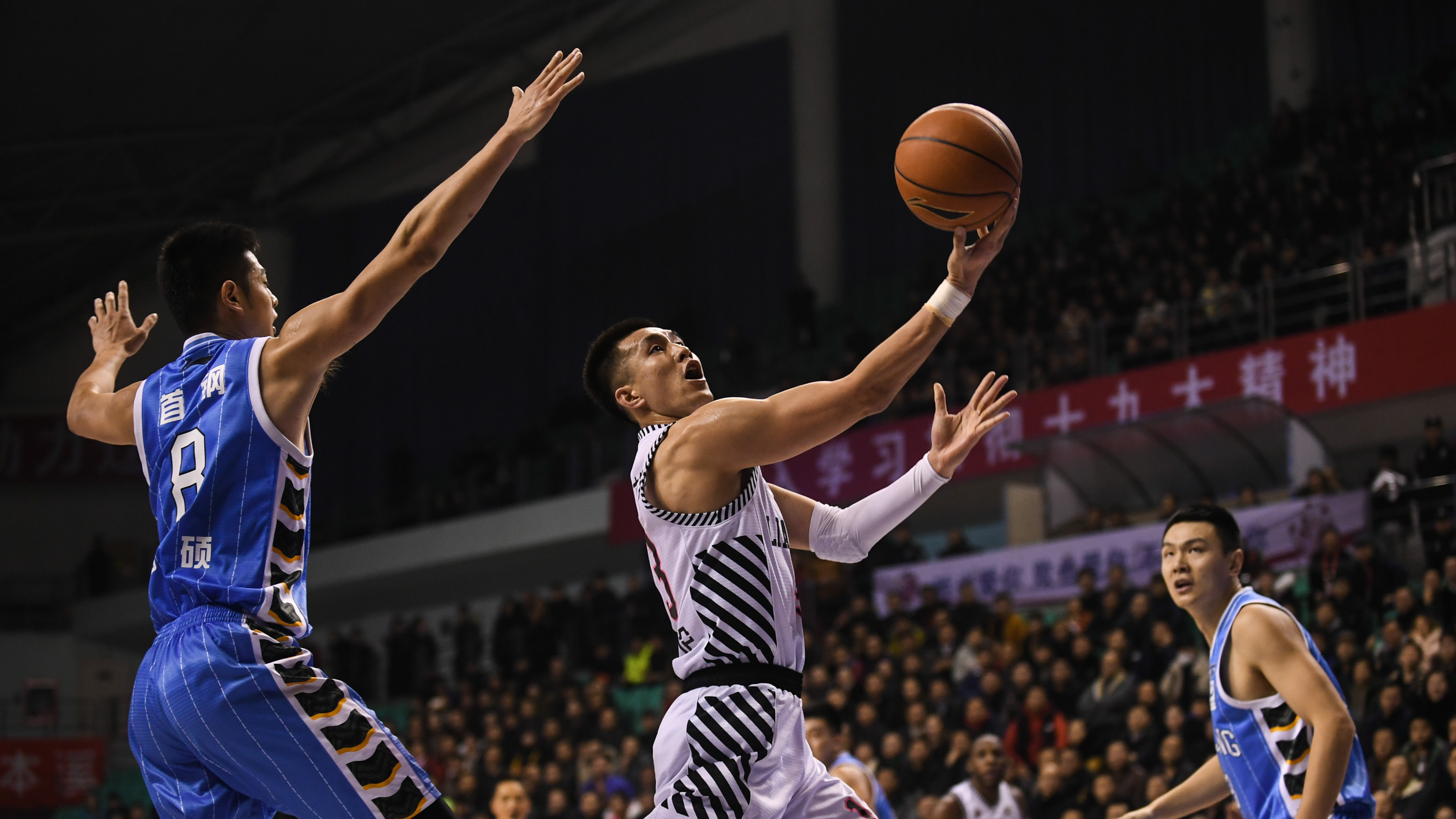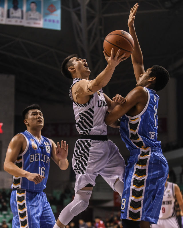 ↑12月6日,辽宁本钢队球员赵继伟(中)在比赛中上篮。新华社记者潘昱龙摄