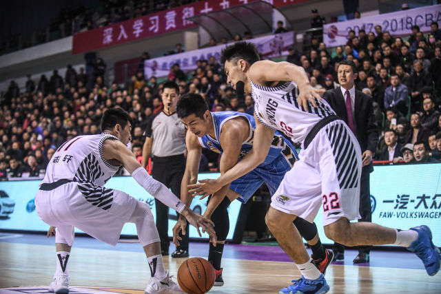 ↑12月6日,北京首钢队球员方硕(中)在比赛中和辽宁本钢队球员刘志轩(左)和李晓旭拼抢。新华社记者潘昱龙摄