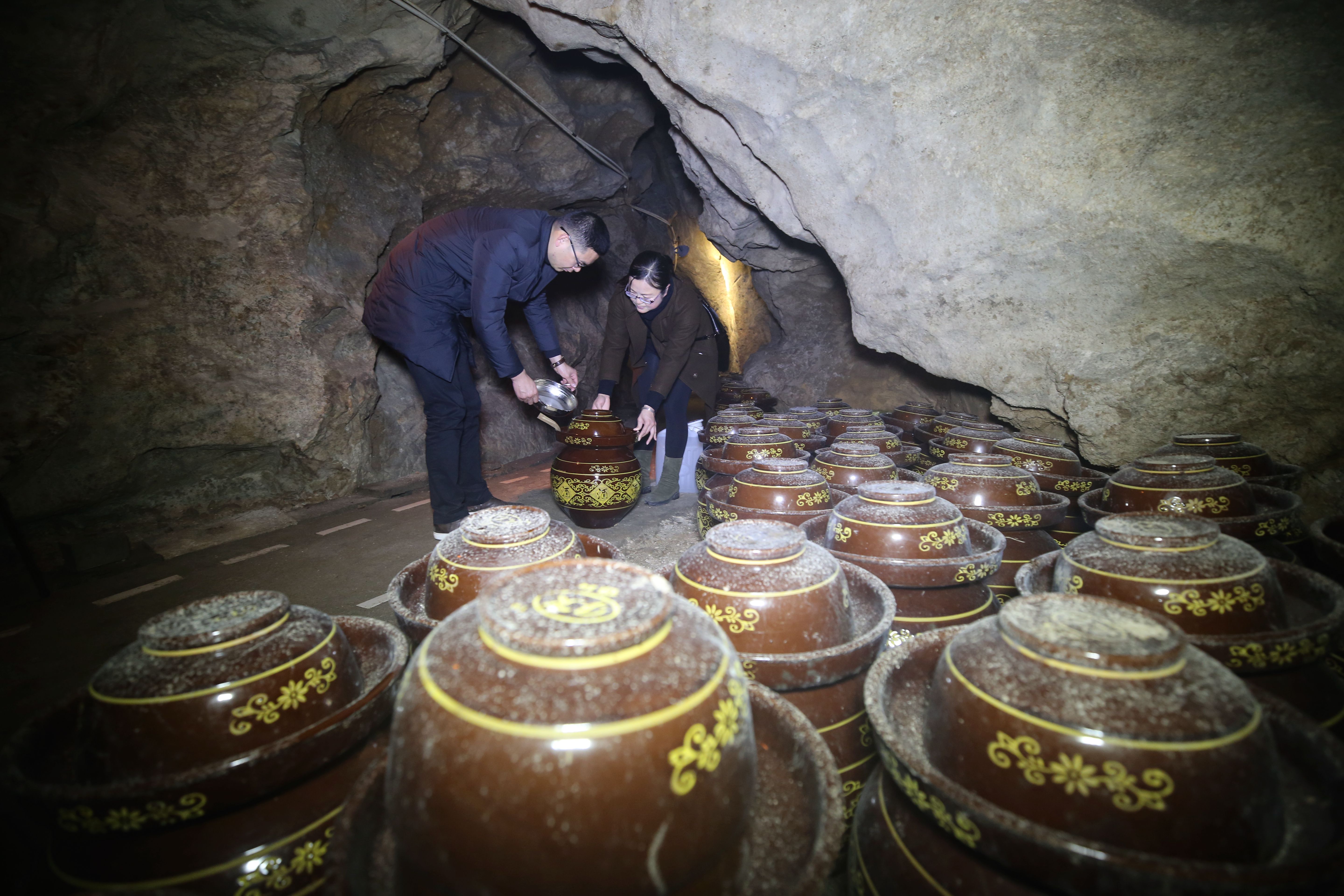 ↑12月12日,在湖南张家界市武陵源区“张家界酒”洞藏基地,工作人员对洞藏酒的密封情况进行巡检。