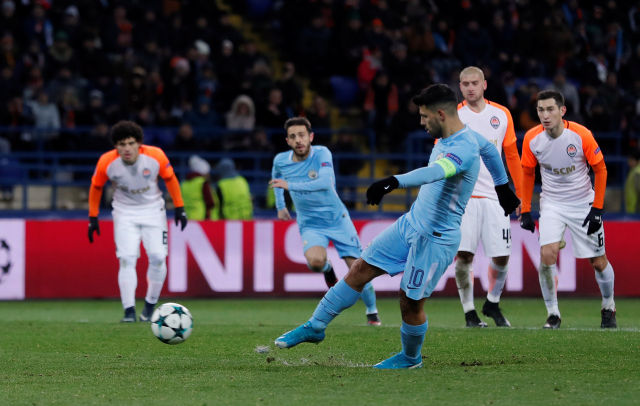 12月6日,曼城队球员阿圭罗(前)在比赛中主罚点球。新华社/路透