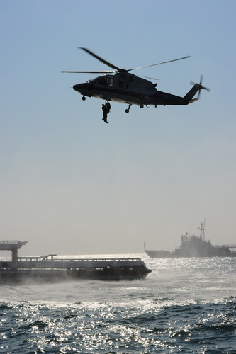 12月19日,参加联合巡航的直升机进行救援演练。当日,海南海事局和南海救助局、南海第一救助飞行队在海南三亚以南附近海域开展首次海空联合巡航。此次巡航旨在整合海事巡航执法力量和专业救助力量,提升专业救助飞行力量使用效能和海事巡航执法现代化水平。新华社发(沙晓峰 摄)